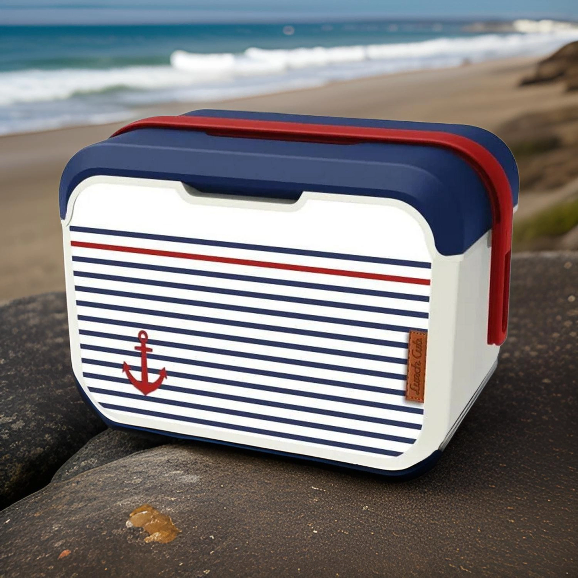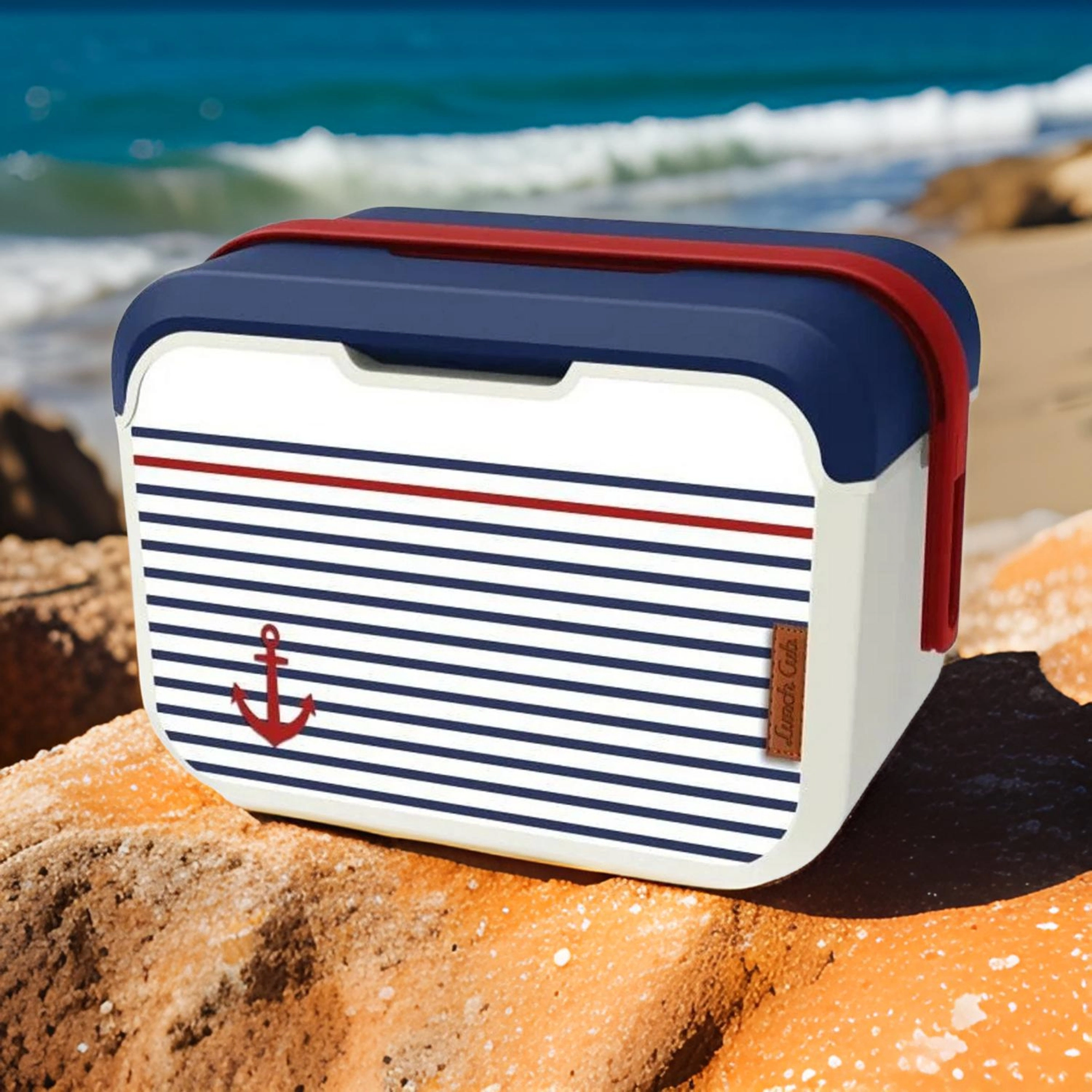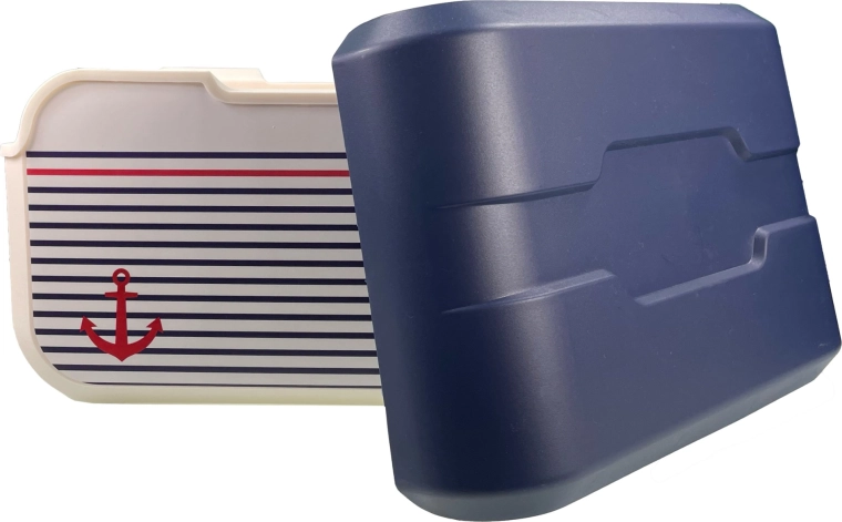 Corpo color vaniglia, coperchio blu e icona dell’ancora: perfetto per la spiaggia e il lago. La resistente plastica PP è inoltre facile da pulire.