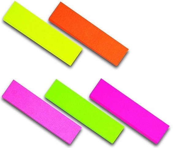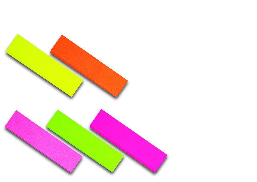 Pratici segnapagina adesivi neon per un rapido contrassegno e una facile orientazione nei documenti. La confezione offre 5 colori vivaci da 100 fogli ciascuno (verde, giallo, arancione, rosa, rosa scuro). I segnapagina sono facilmente rimovibili senza lasciare tracce e, grazie al formato 12 × 50 mm, si adattano anche ai margini di pagine, quaderni e libri.
