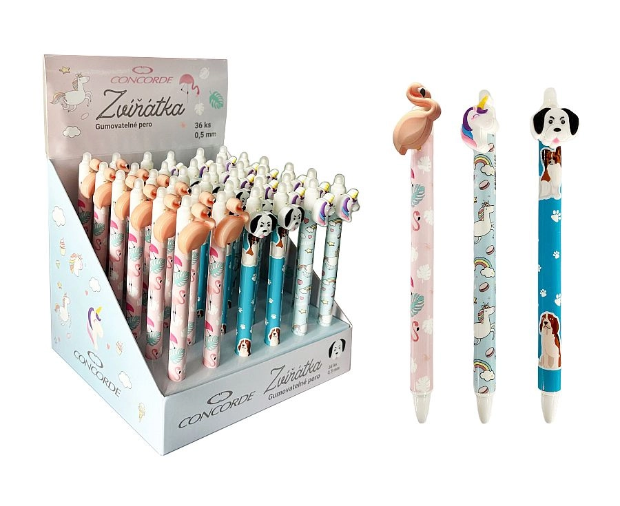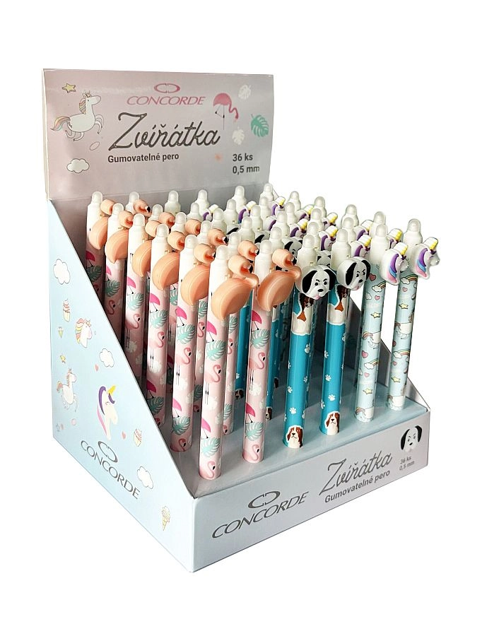La simpatica e pratica penna gel cancellabile CONCORDE Animaletti è perfetta per scuola e ufficio. Grazie alla gomma integrata all'estremità della penna è possibile cancellare facilmente il testo scritto e riscrivere subito senza danneggiare la carta. Le attraenti colorazioni pastello e i motivi di animali (fenicottero, cagnolino, unicorno) piaceranno a bambini e adulti. La punta fine da 0,5 mm e l'inchiostro blu garantiscono una scrittura pulita e precisa.