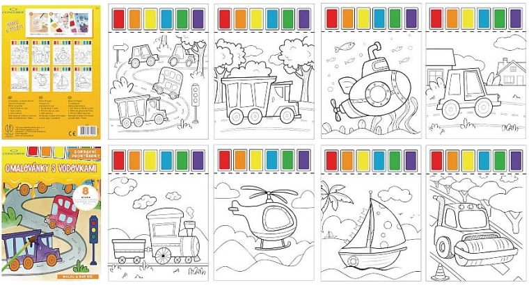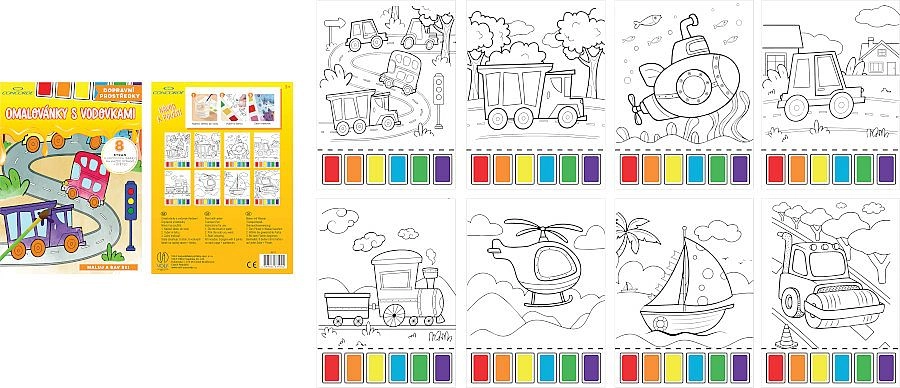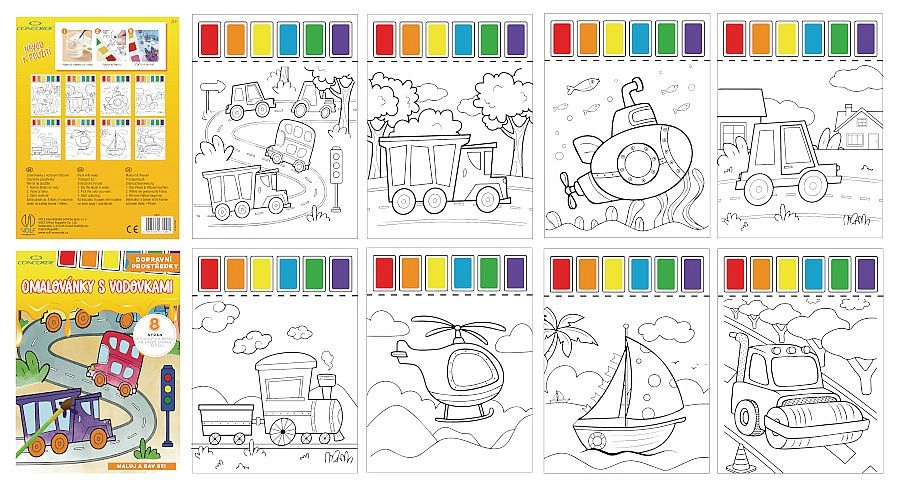 Scopri il mondo dei colori con gli album da colorare Concorde a tema mezzi di trasporto. Ognuna delle 8 immagini è pronta per essere colorata immediatamente grazie alla tavolozza integrata con 6 colori ad acquerello di base nella parte superiore della pagina. Nella confezione è incluso anche un pennello, quindi non è necessario alcun accessorio aggiuntivo.