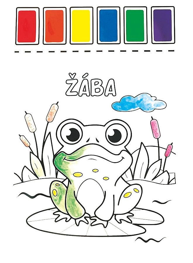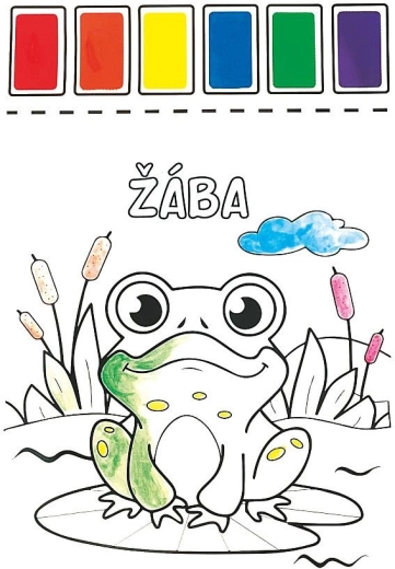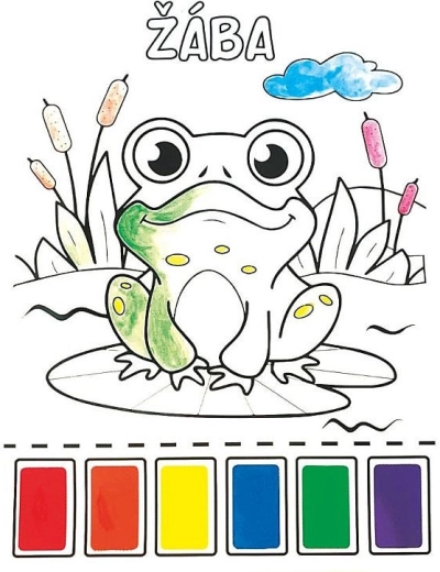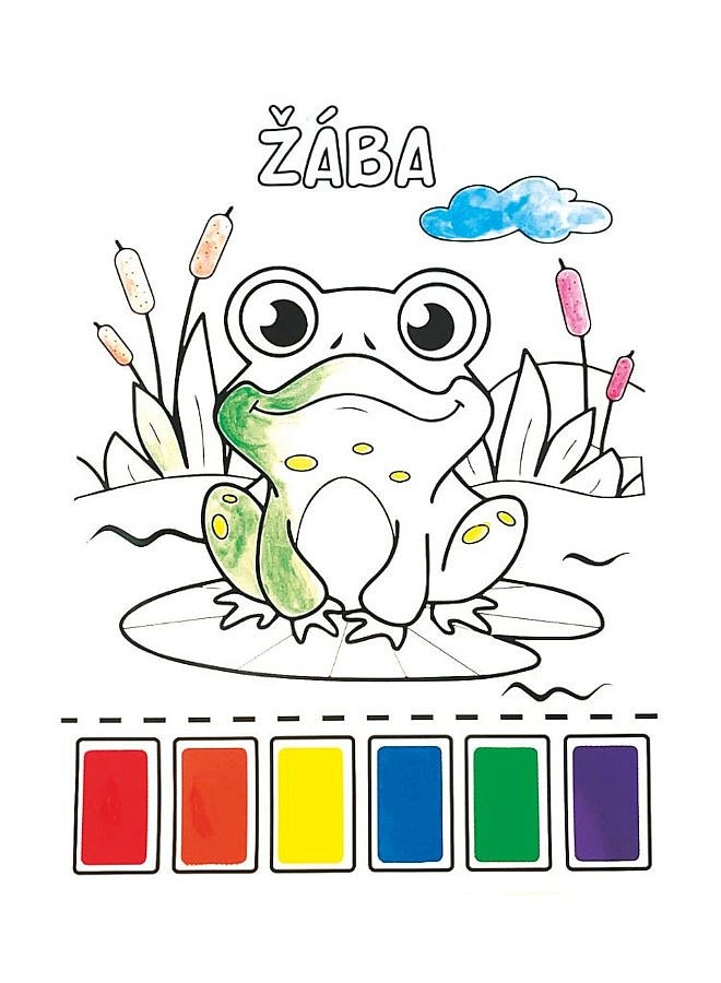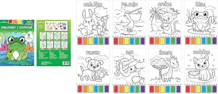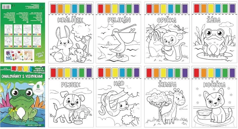 Divertenti album da colorare con acquerelli per bambini, con 8 immagini a tema di allegri animaletti in formato A4. Ogni foglio ha in alto 6 colori ad acquerello (rosso, arancione, giallo, blu, verde, viola) già pronti, e la confezione include un pennello da pittura per creare subito senza bisogno di altri accessori.