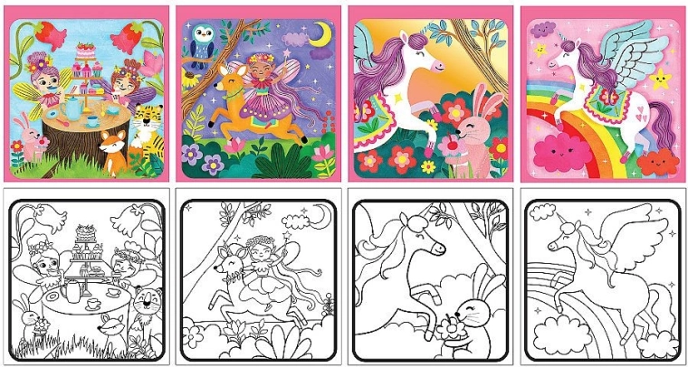 Scopri divertenti e riutilizzabili libri da colorare magici con motivi di unicorni e fate, che si colorano solo con acqua. Basta riempire il pennello in dotazione con acqua e i colori appariranno magicamente passando sulla superficie bianca. Una volta asciutti, i libri da colorare tornano all'aspetto originale e puoi colorarli più e più volte – senza disordine e senza pastelli.