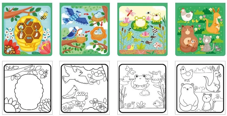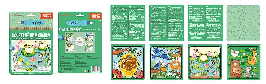 Nella confezione trovi 4 robuste immagini in cartone con motivi della natura e un pennello speciale ricaricabile con acqua. Senza inchiostro, senza sporcare – solo acqua e divertimento senza fine.