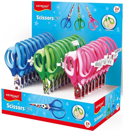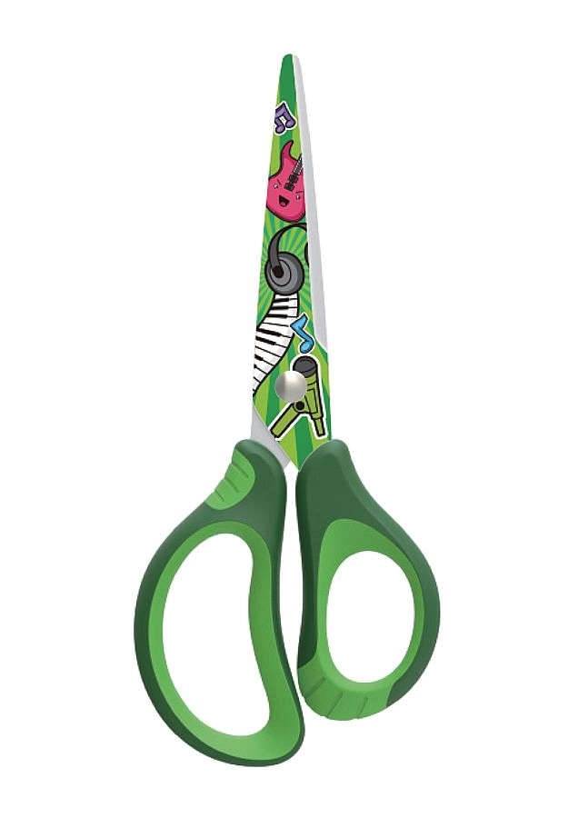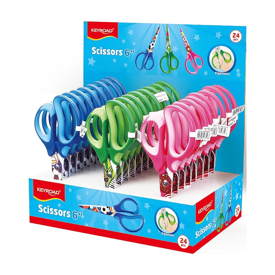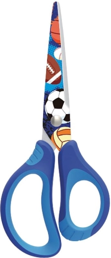 Pratiche forbici scolastiche con punta arrotondata e stampa moderna, ideali per bambini e studenti. Offrono una impugnatura ergonomica morbida per una presa confortevole, lame in acciaio di qualità per un taglio pulito e un design sicuro adatto alla scuola. Fornite in un mix di 3 colori.