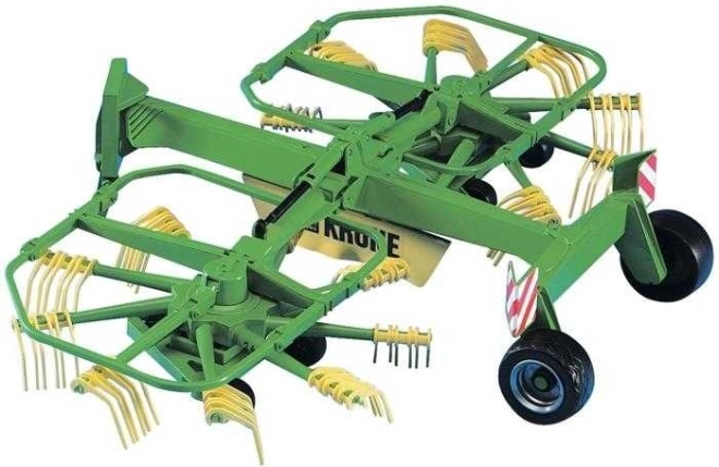 Il modello Bruder raccoglifieno Krone è una versione ridotta ma fedele del vero raccoglitore di fieno del marchio Krone. È dotato di due bracci con palette che ruotano attorno al proprio asse, permettendo di simulare l'attività reale del raccoglitore.