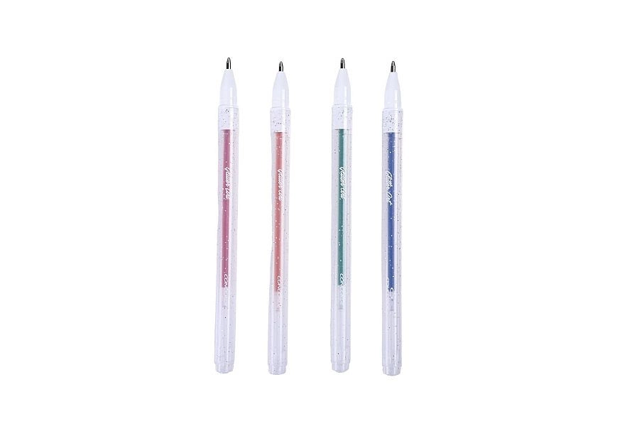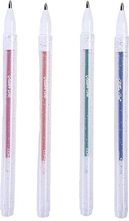 Ogni penna ha una ricarica monouso con inchiostro glitter riccamente pigmentato, che risalta sia sulla carta bianca sia su quella più scura. Il set si ripone e si trasporta facilmente nel custodia in plastica trasparente, che mantiene in ordine tutte e 12 le penne.