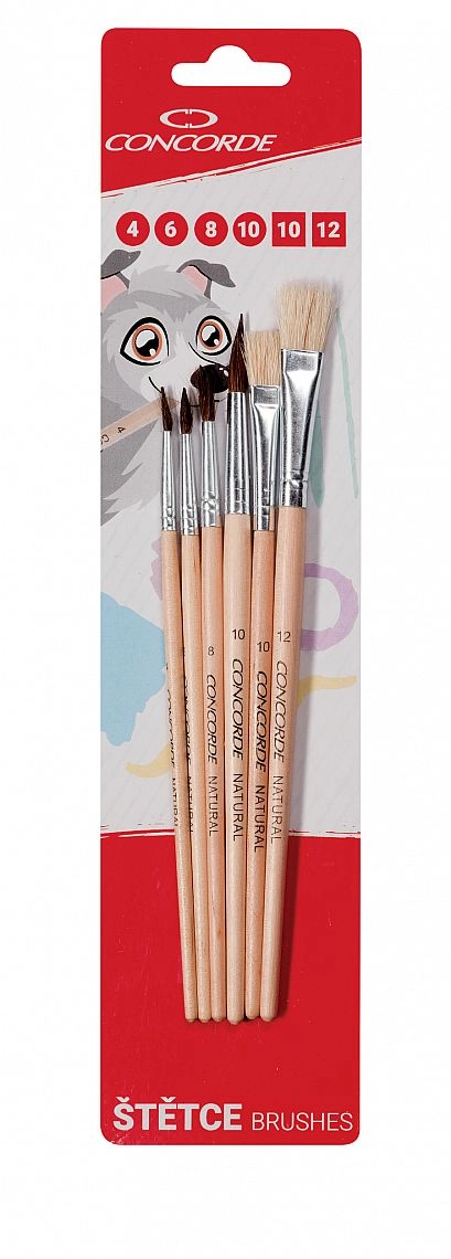Set universale di pennelli CONCORDE per scuola, hobby e laboratorio, in totale 6 pezzi – pennelli tondi in pelo n. 4, 6, 8, 10 e pennelli piatti in setola n. 10, 12. Grazie alle fibre naturali e al manico in legno laccato offrono una presa confortevole e garantiscono lavoro preciso e lunga durata. Confezione in blister pratico per una facile conservazione.