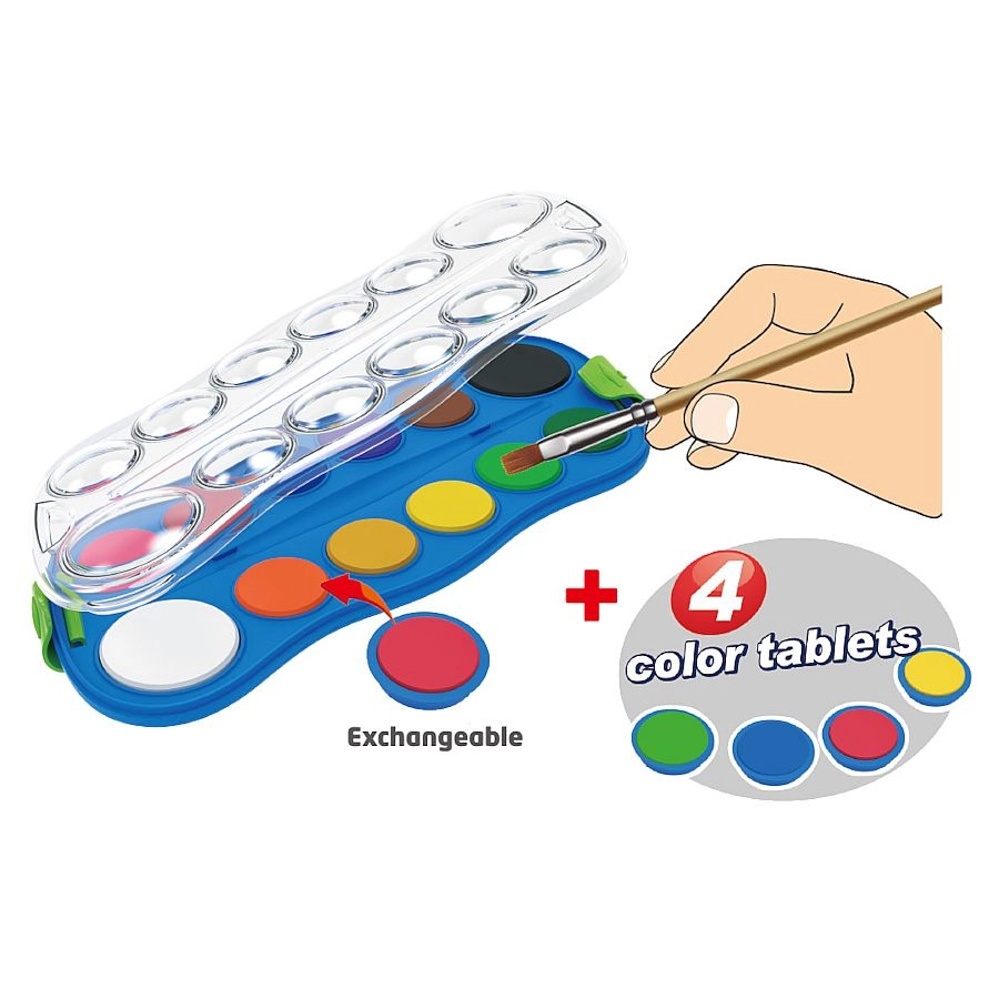 La confezione comprende 12 colori di base arricchiti da 4 colori intercambiabili, che ampliano le tue possibilità creative. I colori si applicano con facilità, si mescolano bene e sono adatti a carta e tecniche pittoriche ad acqua.