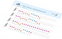 Gli spartiti con codifica a colori allegati (ad es. “Old MacDonald”) aiutano i bambini ad associare i colori ai suoni e a imparare rapidamente le prime melodie.
