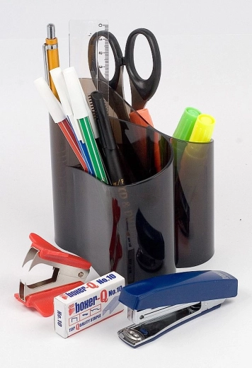 Organizza il piano di lavoro con il pratico portapenne ICO Lux. La finitura nero trasparente ha un aspetto moderno e al contempo consente una migliore visibilità degli accessori riposti. Tre settori separati aiutano a dividere facilmente matite, evidenziatori, forbici o righelli.