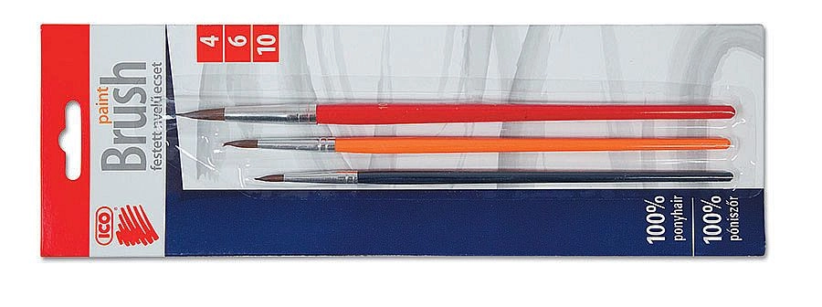 Pratico set di tre pennelli tondi ICO nelle misure 4, 6 e 10, ideale per scuola, hobby e atelier. Offrono setole in pelo di qualità per una pennellata fluida, manici in legno laccato per una presa confortevole e uso universale per acquerello, gouache e colori scolastici.
