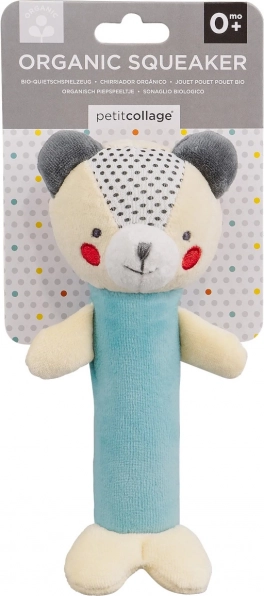 Adorabile sonaglino squeak a forma di orsetto di Petit Collage che aiuta i bambini a sviluppare la motricità fine e la percezione sensoriale. È morbido, facile da afferrare dalle manine e realizzato in cotone organico certificato GOTS con colori a base vegetale – ideale per il gioco quotidiano e il divertimento in viaggio.