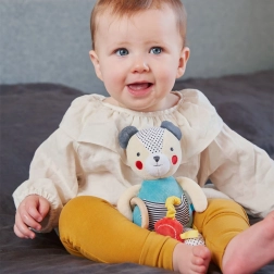 L’orsetto con massaggiagengive Petit Collage si distingue per la qualità della lavorazione e i materiali delicati. Combina un tessuto morbido con un anello in legno per offrire comfort durante le coccole e sollievo durante la masticazione. Grazie a texture e colori studiati, sostiene lo sviluppo tattile, visivo e motorio fin dai primi giorni.