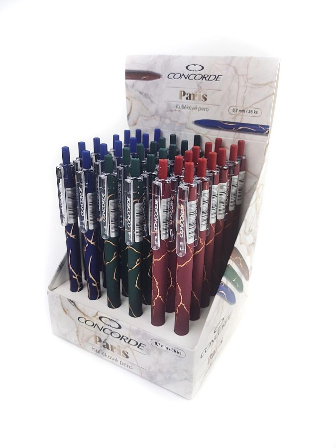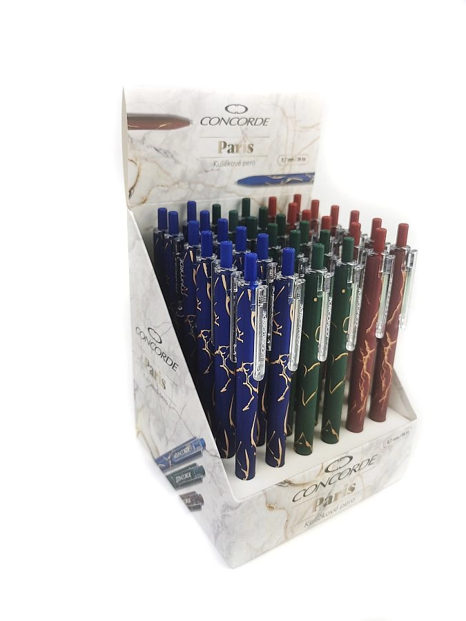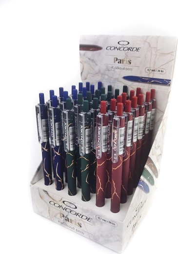 L'elegante penna a sfera CONCORDE Paris dal raffinato design marmorizzato offre una scrittura fluida e scorrevole grazie alla ricarica in gel e alla punta da 0,7 mm. Il pratico meccanismo a scatto consente un utilizzo comodo con una sola mano. Disponibile in assortimento di tre colori – blu scuro, verde e rosso – e compatibile con le ricariche Extra e A3.
