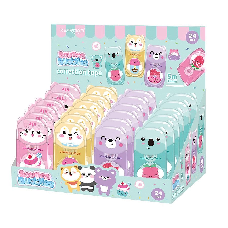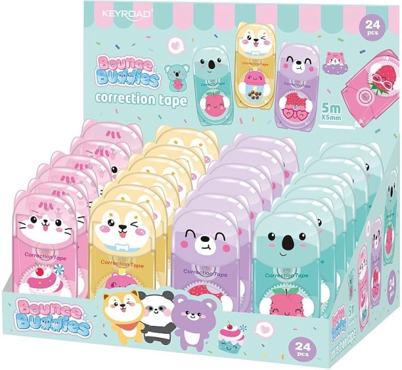 Grazioso correttore a nastro con motivi di animali per correzioni impeccabili. Offre larghezza traccia 5 mm, lunghezza 5 m, scrivibilità immediata e copertura fluida e precisa. Grazie al guscio trasparente controlli facilmente il nastro rimanente e la guida perpendicolare garantisce un uso confortevole anche per mancini.