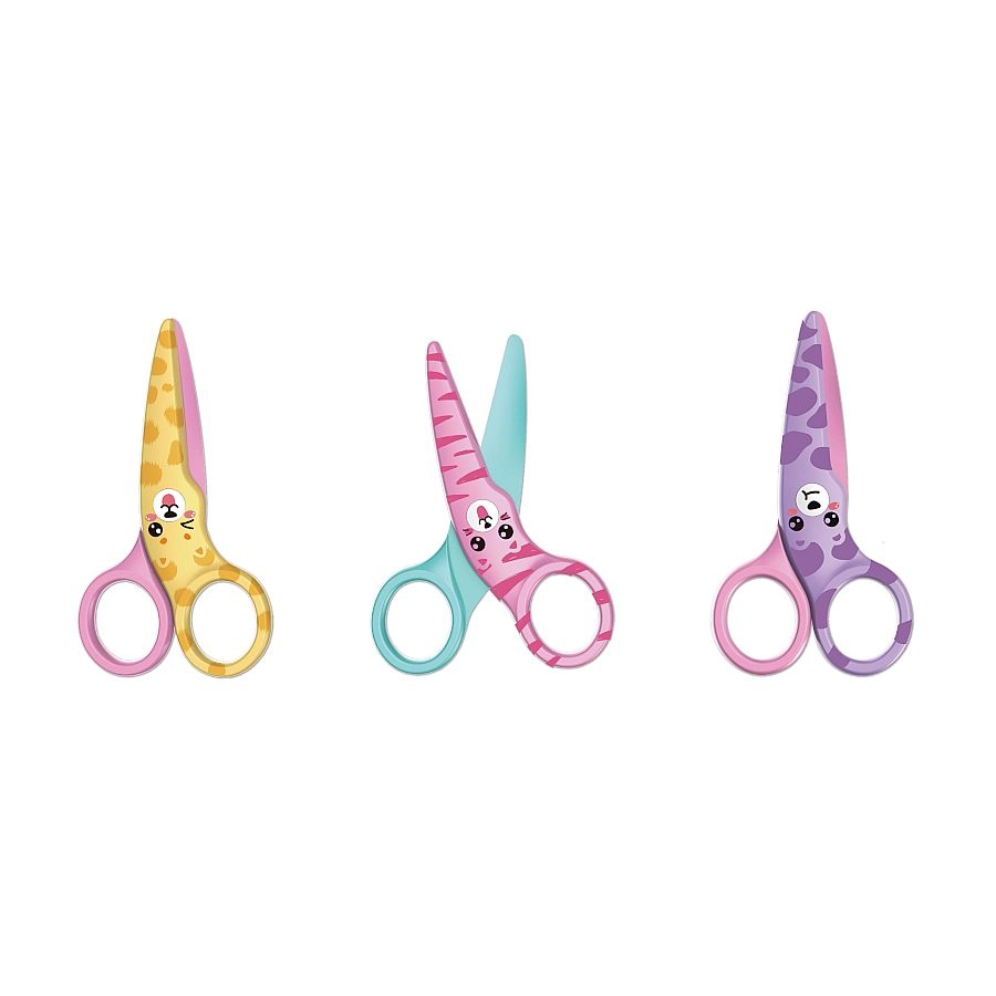 Allegre forbici di sicurezza per bambini con motivi di animaletti, lunghezza 10,5 cm, ideali per le prime attività creative. Hanno una lama non metallica, punta arrotondata e impugnatura ergonomica in plastica per un taglio comodo e sicuro anche per i più piccoli. Disponibili in colori assortiti.