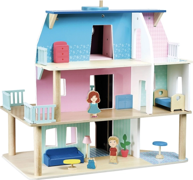 Il set comprende una serie di mobili in legno e figure, compresi il letto, il divano e piccole figure animali. I bambini possono così creare scene domestiche in miniatura.