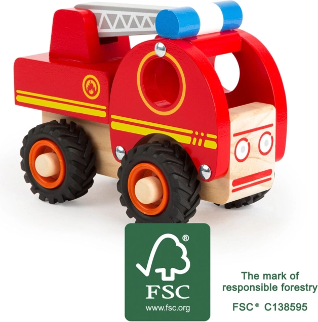 Parti per missioni eroiche di salvataggio con questa splendida auto dei pompieri lavorata realizzata in legno 100% FSC. Il design non è solo realistico ma anche sicuro per le mani dei piccoli grazie al materiale solido e ai bordi arrotondati. Il giocattolo offre spazio sufficiente per le figure e una scala mobile per ampliare le possibilità di gioco.