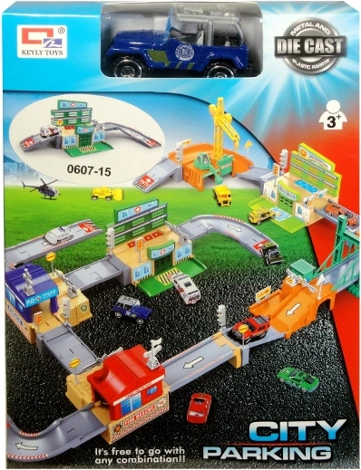 - Macchinina in metallo, pezzi per costruire il parcheggio (tratti di strada, rampe, edifici, decorazioni)
