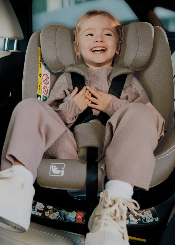 Con un solo gesto ruoti il seggiolino verso la portiera, allacci comodamente il bambino e lo riporti nella posizione sicura sia nel senso di marcia che in senso contrario.