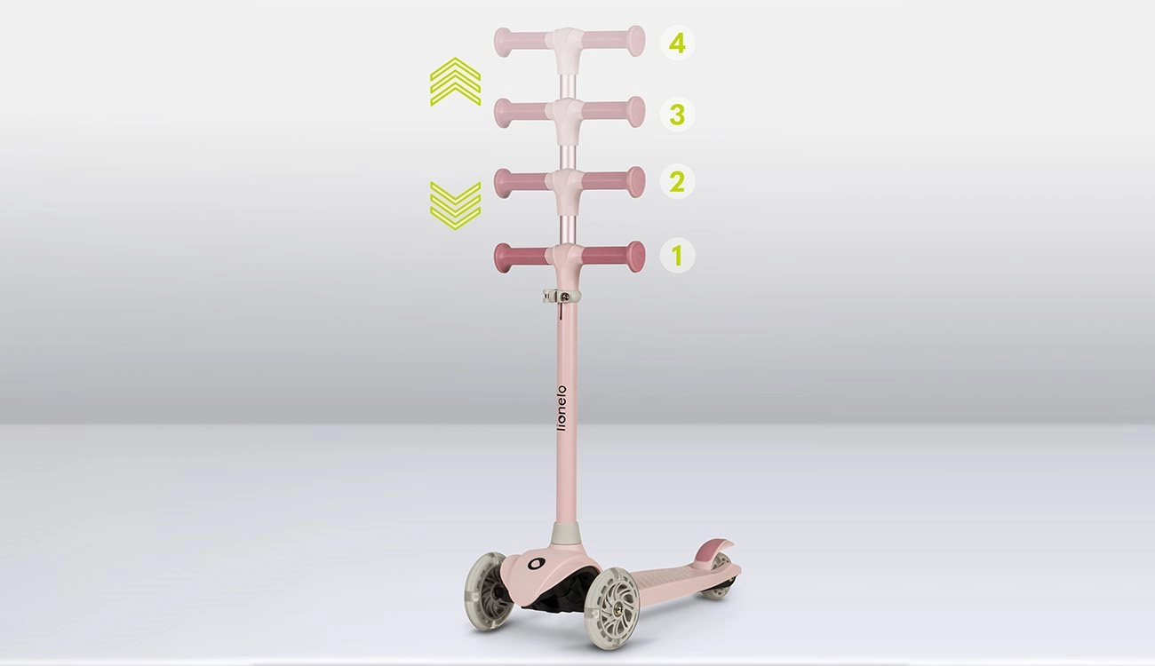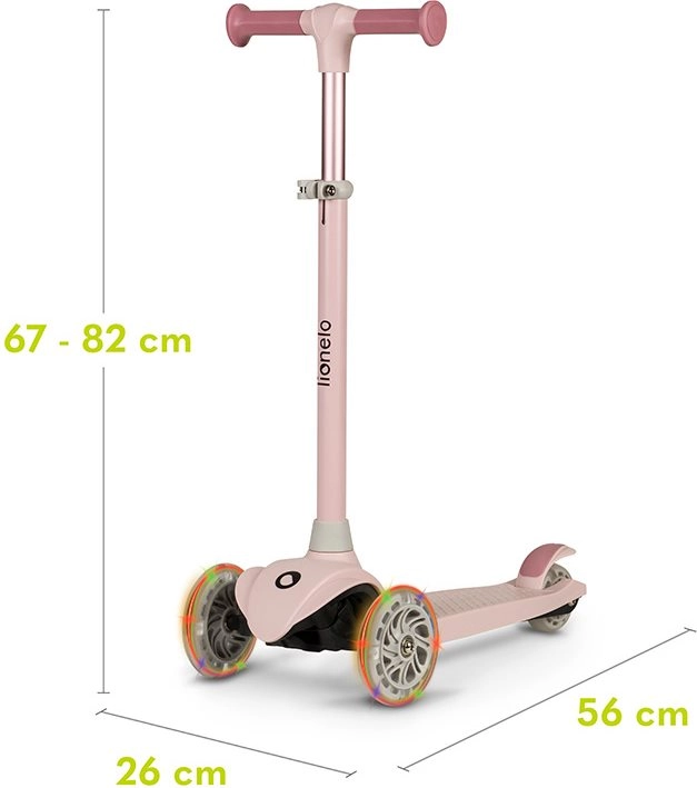 Il monopattino a tre ruote per bambini leggero e stabile LIONELO Jessy Pink Rose favorisce l’equilibrio e la motricità dei più piccoli. Offre regolazione dell’altezza del manubrio a 4 livelli, pedana antiscivolo, freno posteriore a pedale e ruote LED luminose con cuscinetti ABEC-7 per una guida fluida. Portata massima 50 kg e limitazione dell’angolo di sterzata a 65° per un controllo più sicuro.