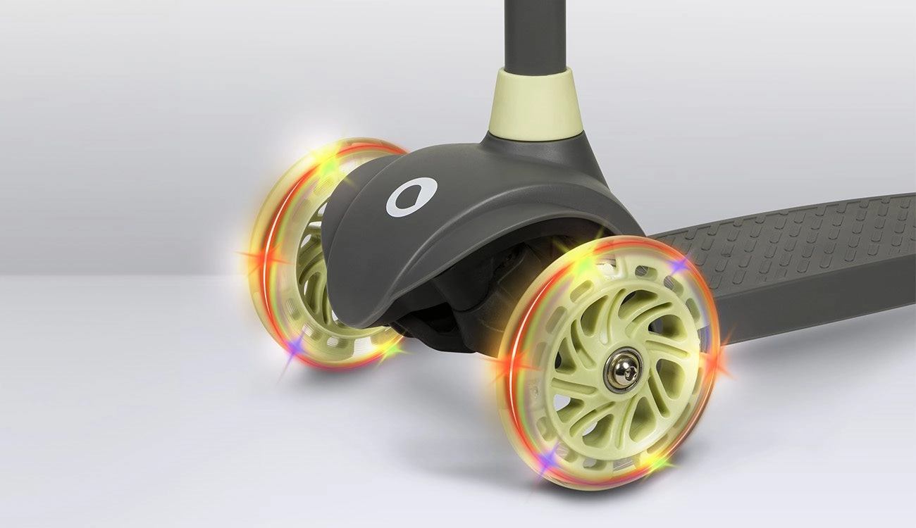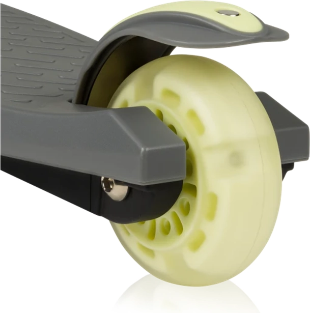 Le luci LED nelle ruote si accendono durante la guida, rendendo il bambino più visibile e la corsa più divertente. I cuscinetti di qualità ABEC-7 assicurano uno scorrimento fluido e il freno posteriore a pedale permette arresti facili e sicuri. Il limitatore dell’angolo di sterzo a 65° aiuta a prevenire curve troppo strette e aumenta la sicurezza dei principianti.