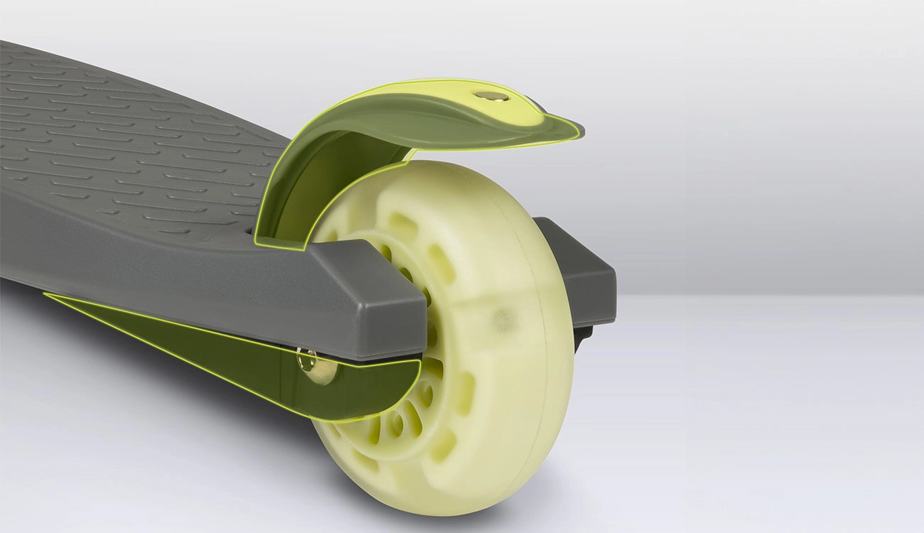 Le ruote anteriori si illuminano durante la marcia senza bisogno di batterie. Il bambino è più visibile e la guida è più divertente, soprattutto al crepuscolo.