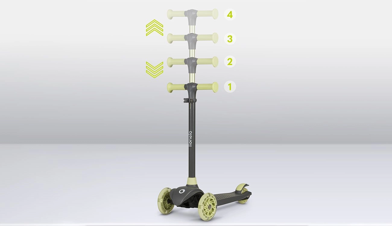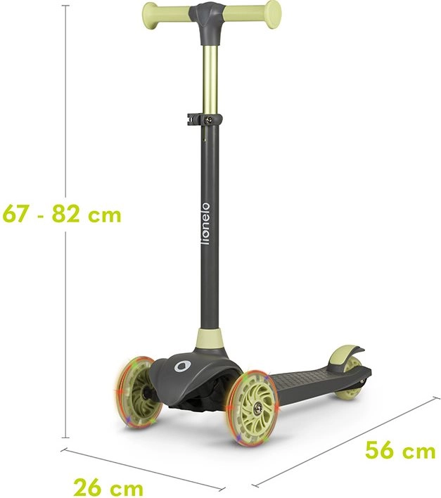 Monopattino per bambini LIONELO Jessy leggero e stabile con tre ruote, ideale per imparare a guidare e mantenere l’equilibrio in sicurezza. Grazie alle ruote LED, al manubrio regolabile su 4 livelli e alla pedana antiscivolo, è perfetto per bambini in crescita. Non mancano il freno posteriore a pedale, cuscinetti di qualità ABEC-7 e il limitatori di sterzo a 65° per un maggiore controllo. Portata fino a 50 kg.