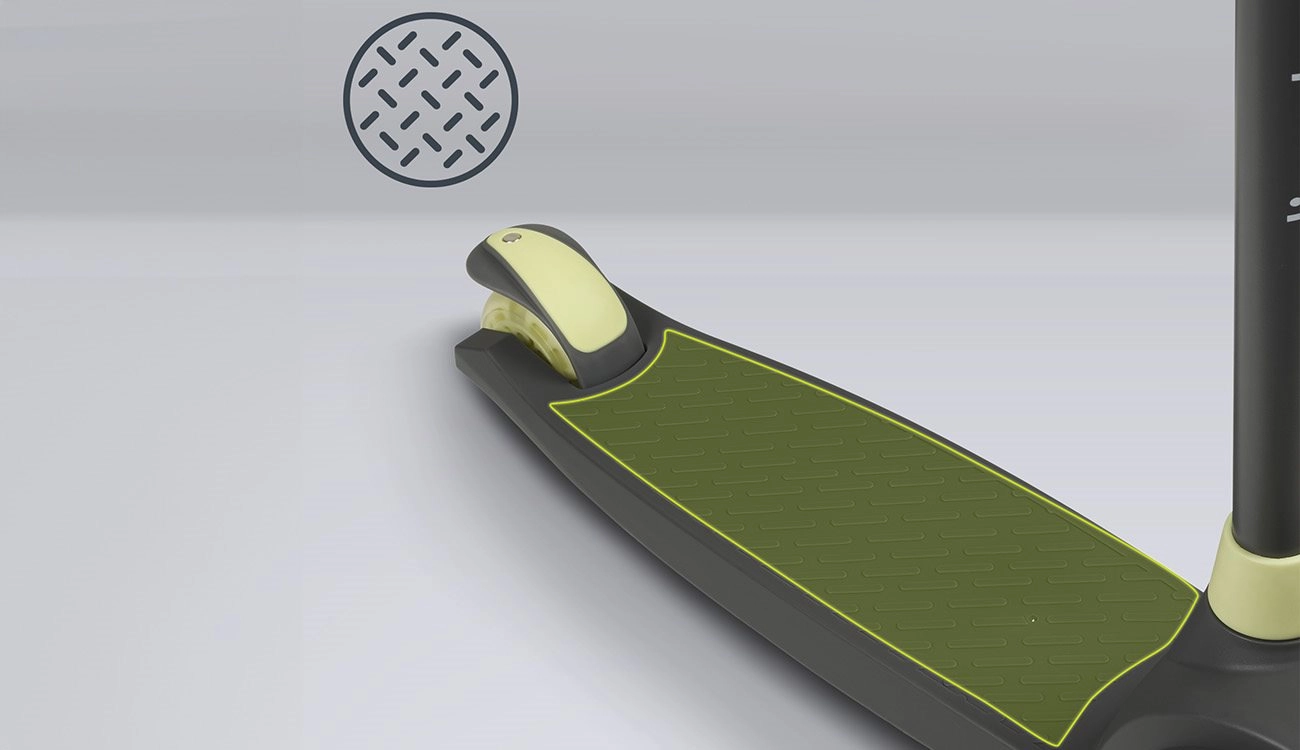 La pedana antiscivolo aumenta la stabilità e il freno posteriore a pedale consente rallentamenti e arresti fluidi e sicuri.