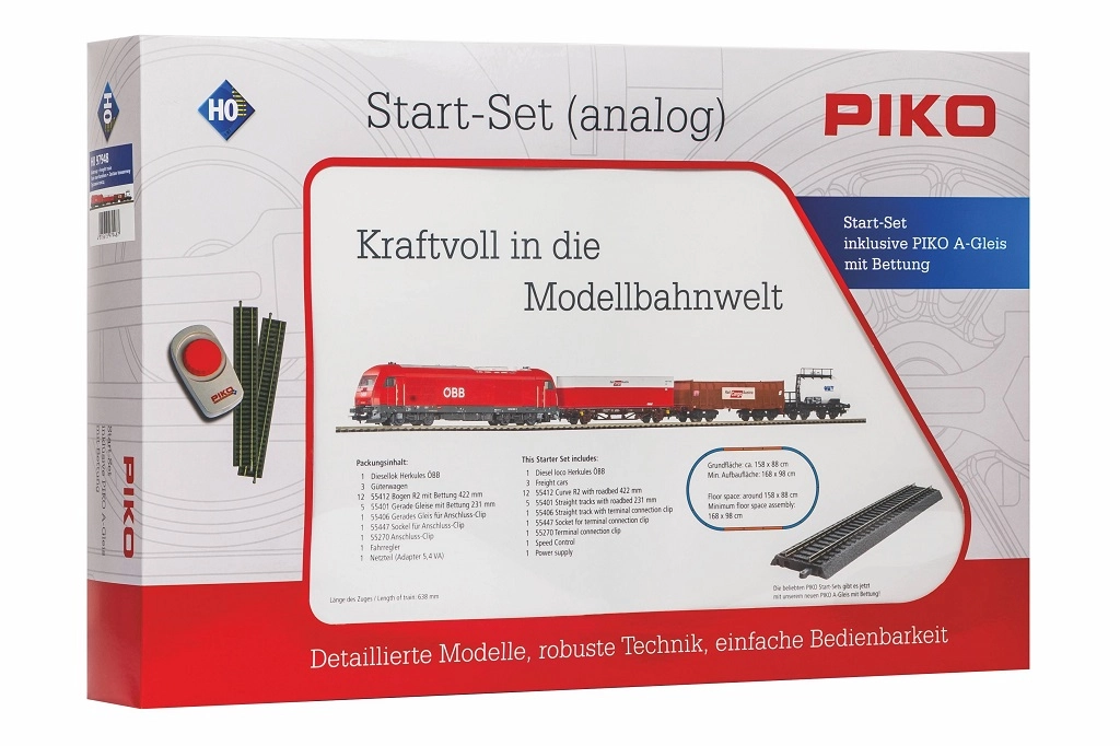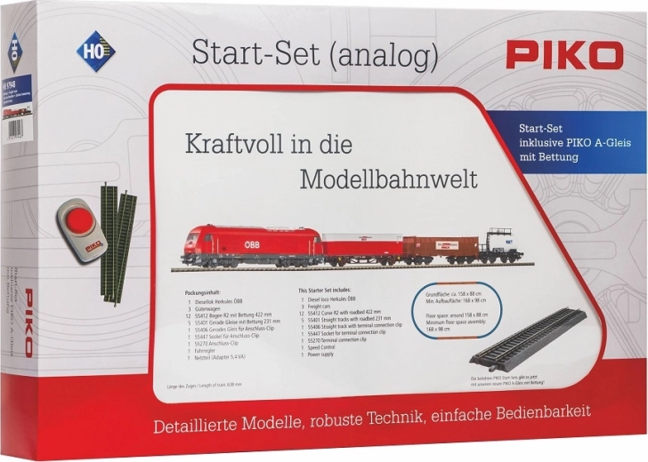 Set modellistico completo PIKO in scala H0 che include tutto per iniziare subito a correre: locomotiva diesel ÖBB Hercules, 3 carri merci, ovale di binari PIKO A-Gleis con massicciata, alimentatore e regolatore analogico. Grazie al montaggio semplice, alla marcia affidabile e alla possibilità di espansione e digitalizzazione (NEM 652) è ideale per principianti e utenti avanzati.