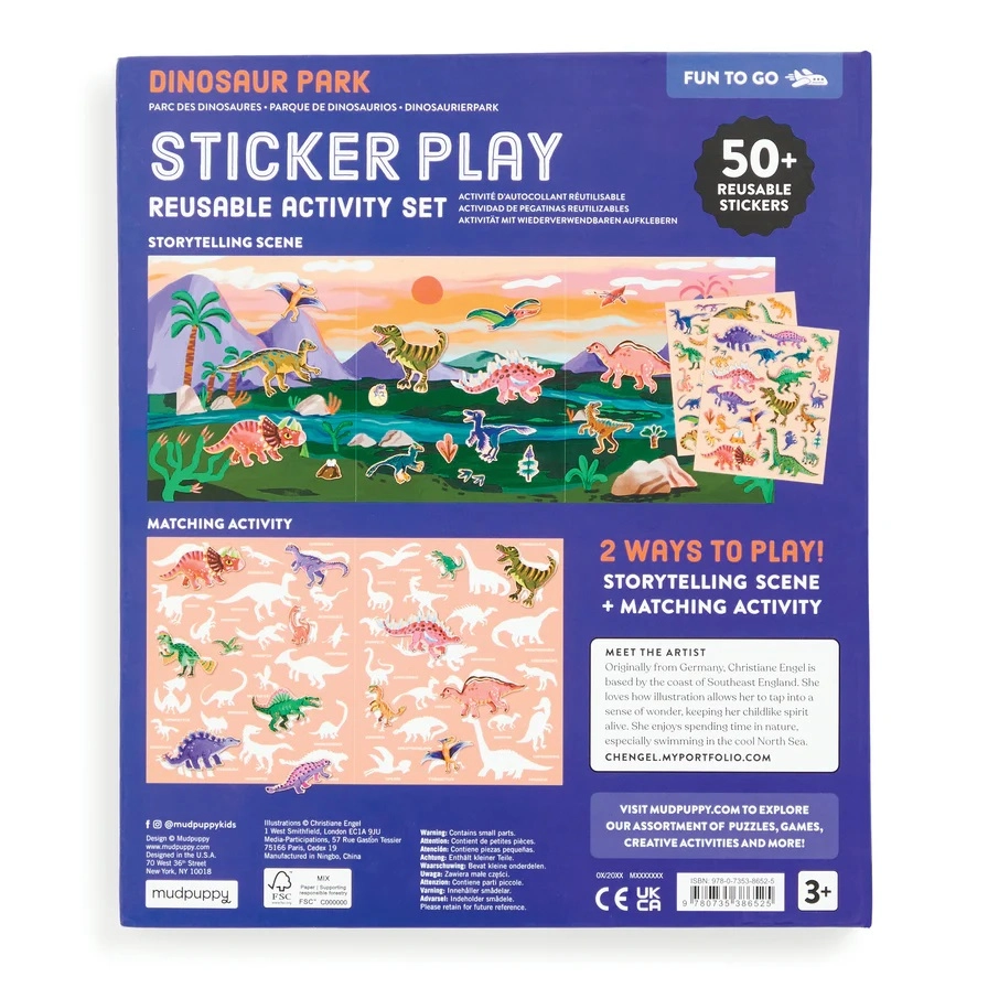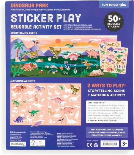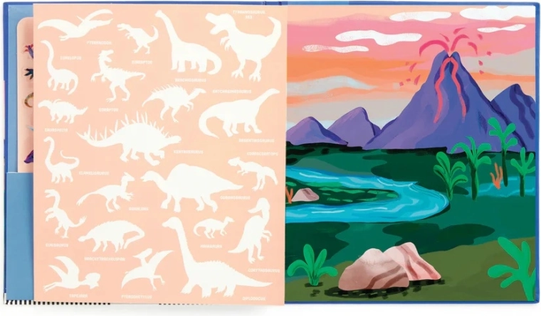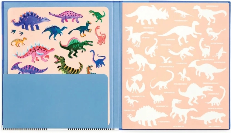 Scopri il colorato mondo preistorico dove prendono vita T‑Rex, Triceratopo e altri amici dinosauri. I bambini possono attaccare, spostare e riutilizzare liberamente gli adesivi: le scene nascono e cambiano in un attimo. Lo sfondo pieghevole offre un'ampia superficie per giocare e raccontare.