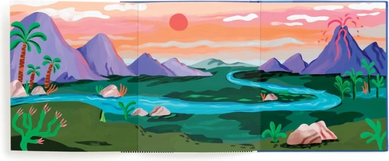 Lo sfondo colorato con fiume, montagne e vulcano offre ampio spazio per giocare e raccontare avventure preistoriche.