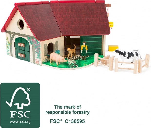 La fattoria è realizzata con legno certificato 100% FSC, e il logo FSC sul prodotto garantisce che il materiale utilizzato proviene da foreste gestite responsabilmente, con enfasi su standard ambientali e sociali rigorosi.