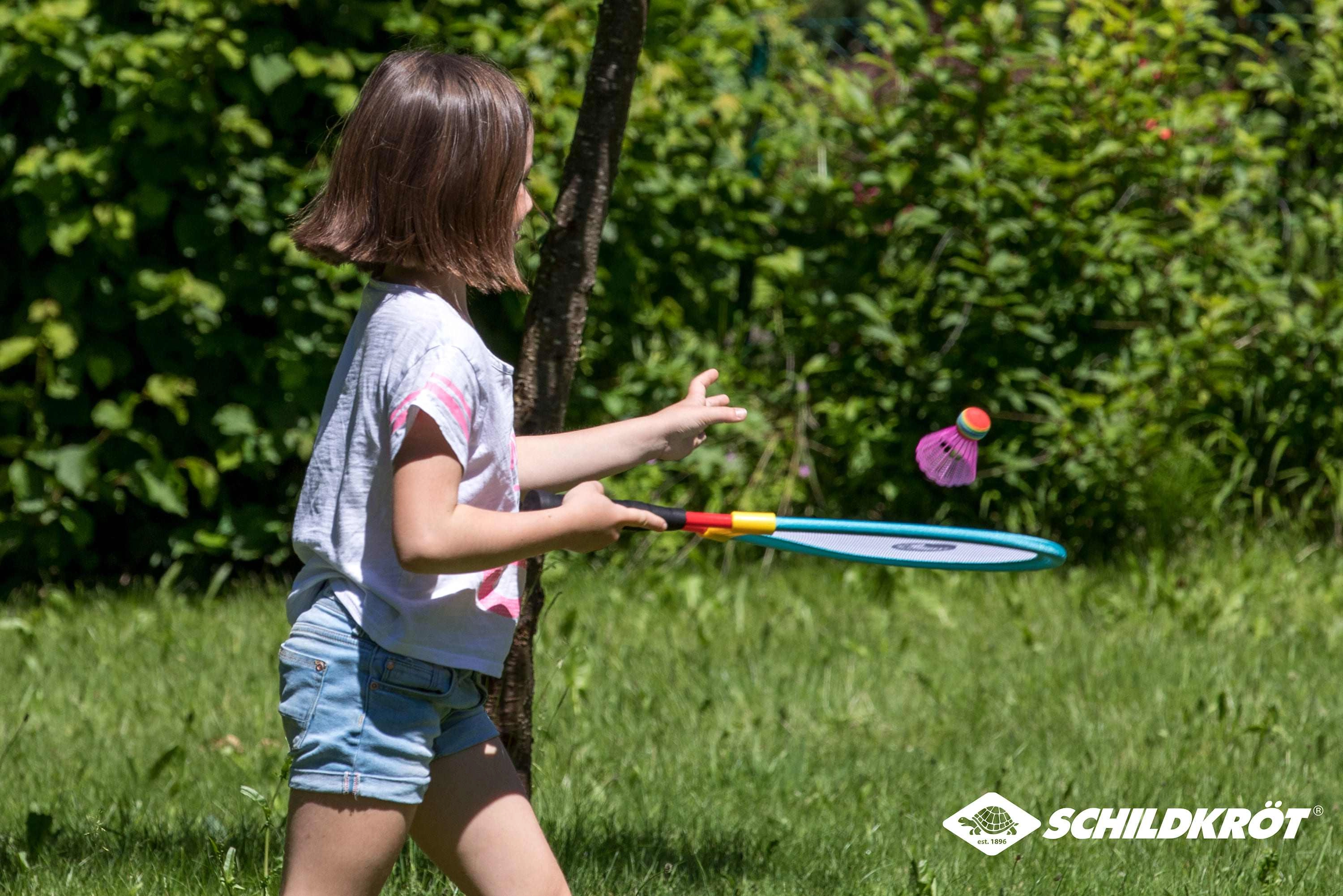 Il set universale del marchio SCHILDKRÖT unisce gli amati sport con racchetta – tennis e badminton – in un unico gioco divertente per tutta la famiglia. Grazie al telaio con rete elastica serve meno forza per colpire, quindi è perfetto per bambini e principianti. Nella confezione trovi 2 racchette grandi (62,5 cm), una pallina morbida e un volano colorato per giocare all’aperto e in casa.
