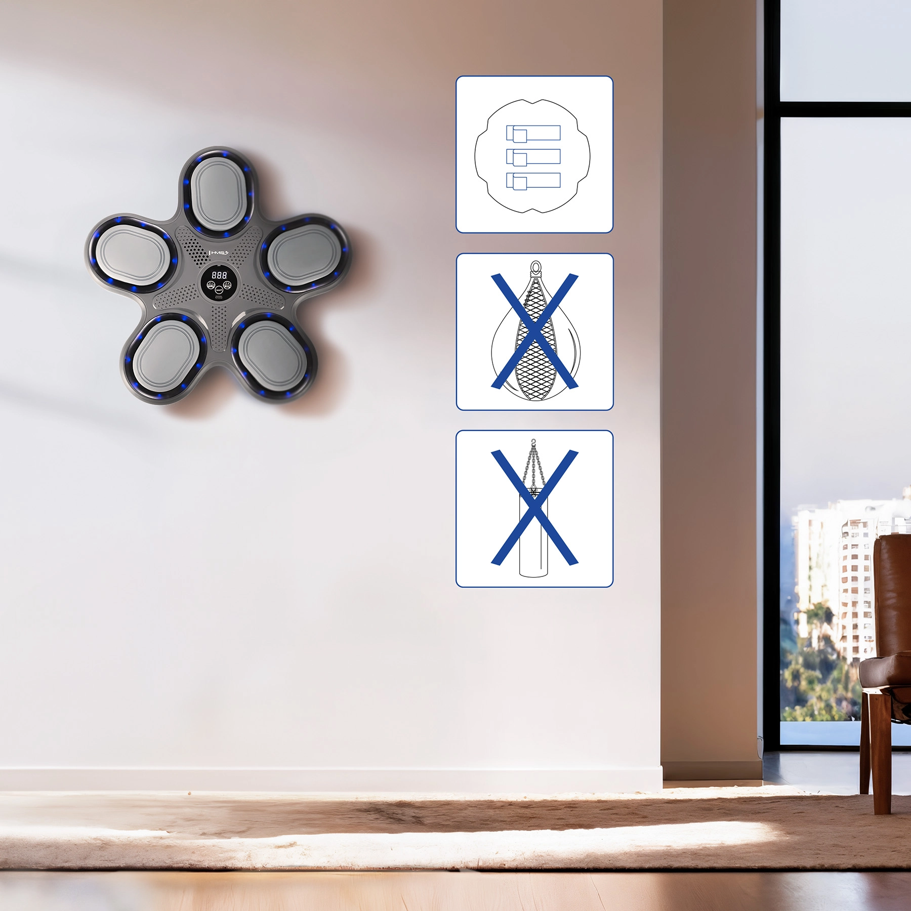 HMS TB11 è un moderno bersaglio da allenamento per uso domestico che combina lo sviluppo efficace di velocità e precisione con un look accattivante. Cinque aree di impatto illuminate si accendono in modo casuale e ti guidano in un allenamento dinamico: segui il numero dei colpi riusciti sul display chiaro e supera i tuoi limiti a ogni nuova serie.