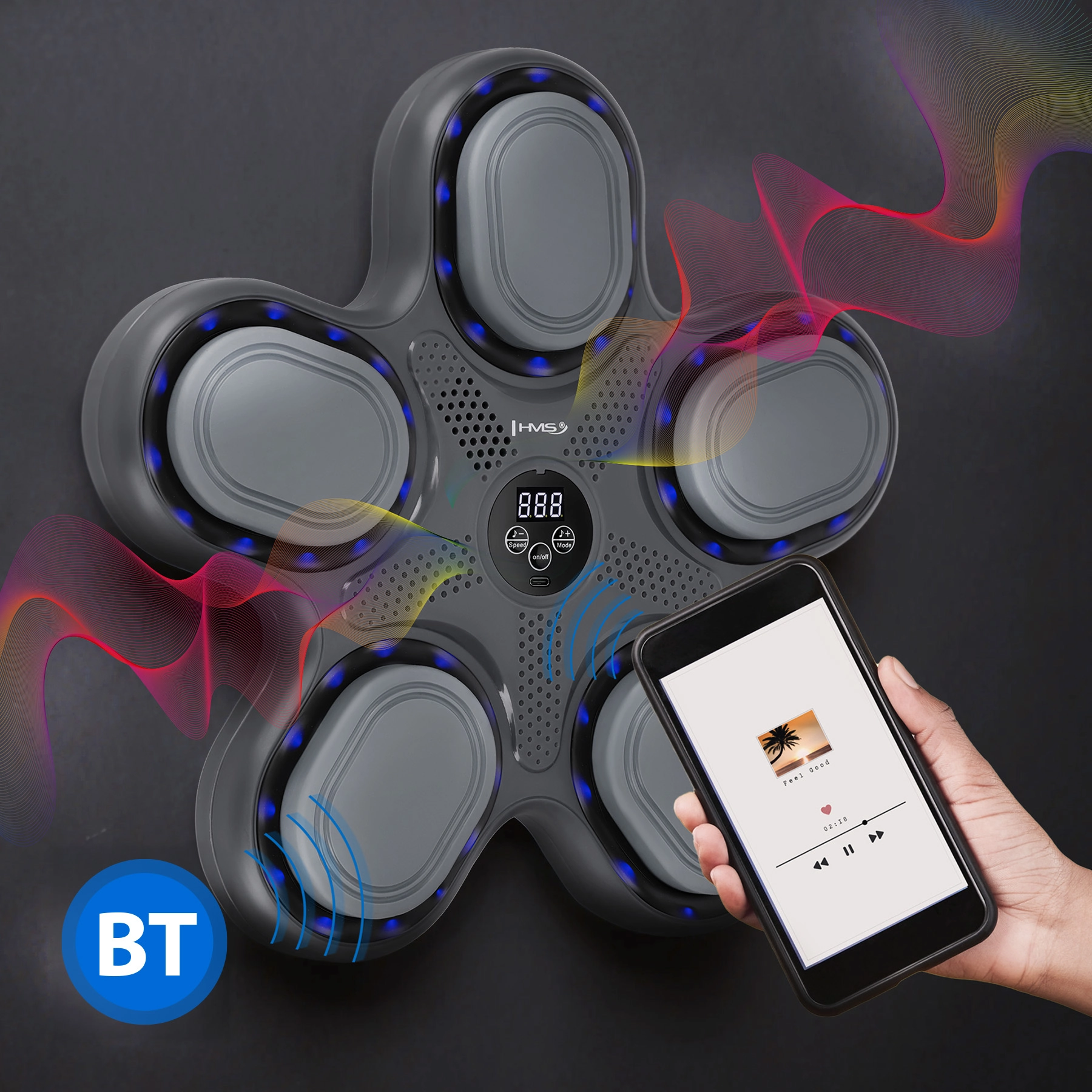 Accelera i tuoi riflessi e rendi l’allenamento più piacevole con il bersaglio da boxe elettronico HMS TB11. Il design unico a stella con retroilluminazione LED, connessione Bluetooth e altoparlante integrato unisce il condizionamento fisico alla musica. Cinque zone attive illuminate a LED ti sfidano a reagire rapidamente, a colpire con precisione e a migliorare la coordinazione mano–occhio. Nella confezione trovi anche guanti MMA per un allenamento confortevole e sicuro.