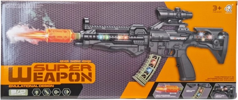 Fucile per bambini dall’aspetto realistico con effetti luminosi e sonori e, dopo l’aggiunta di acqua, crea un effetto fumo. Il giocattolo funziona con batterie AA (non incluse) ed è adatto a bambini dai 3 anni.