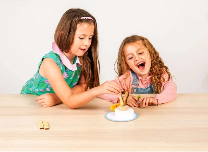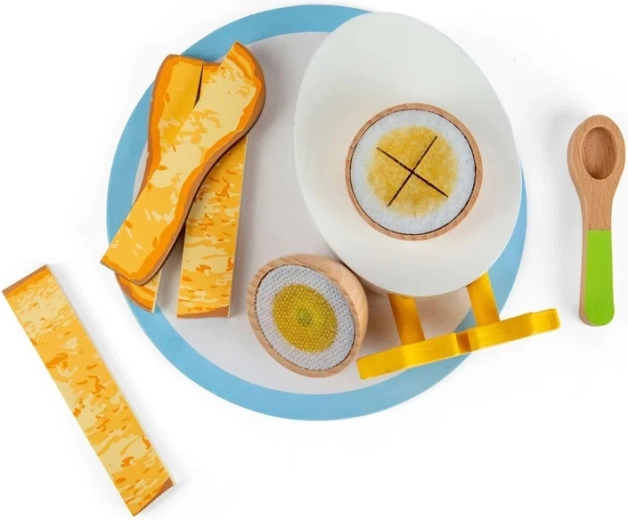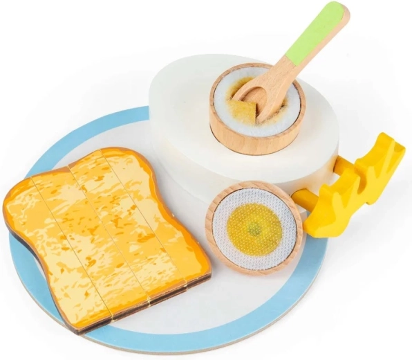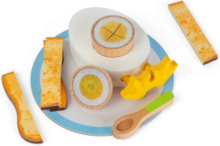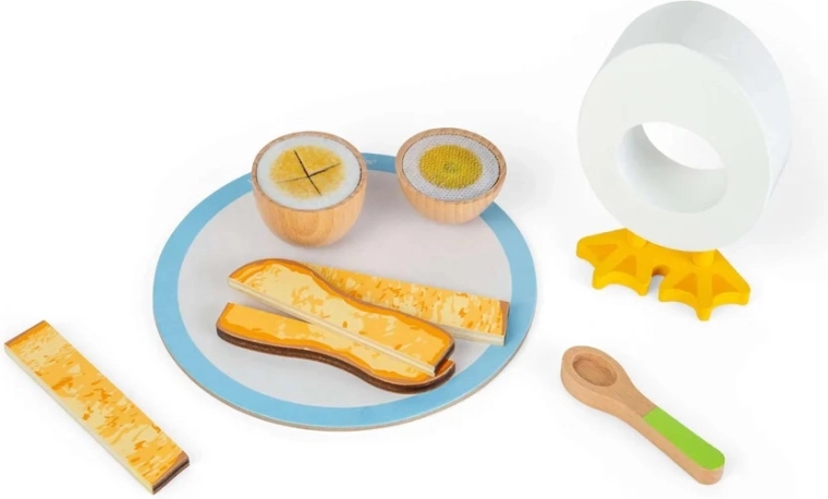 Questo incantevole set colazione in legno offre un’esperienza realistica dell’uovo alla coque: con un grazioso portauovo con piedini da pulcino, due metà d’uovo con morbido tuorlo in feltro e “soldatini” di toast per l’intingolo. I bambini possono servire sul piattino e mangiare con il cucchiaino, sviluppando la coordinazione occhio–mano e la fantasia nel gioco domestico.
