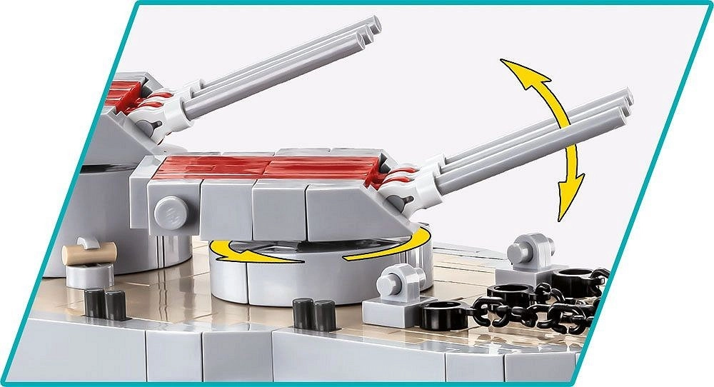 Il modello offre numerosi dettagli funzionali per un'esposizione e un gioco coinvolgenti: torrette d'artiglieria girevoli, elevazione delle canne regolabile, eliche e timoni come elementi mobili ed un elegante supporto espositivo con targhetta. I pezzi stampati di alta qualità garantiscono stabilità dei colori e delle forme.