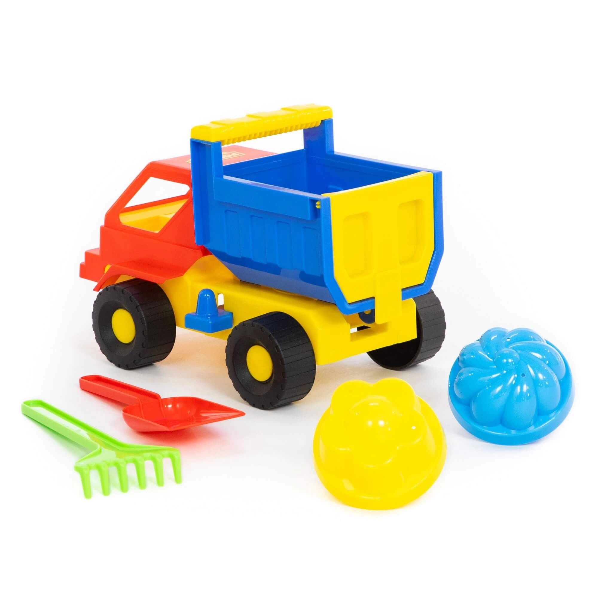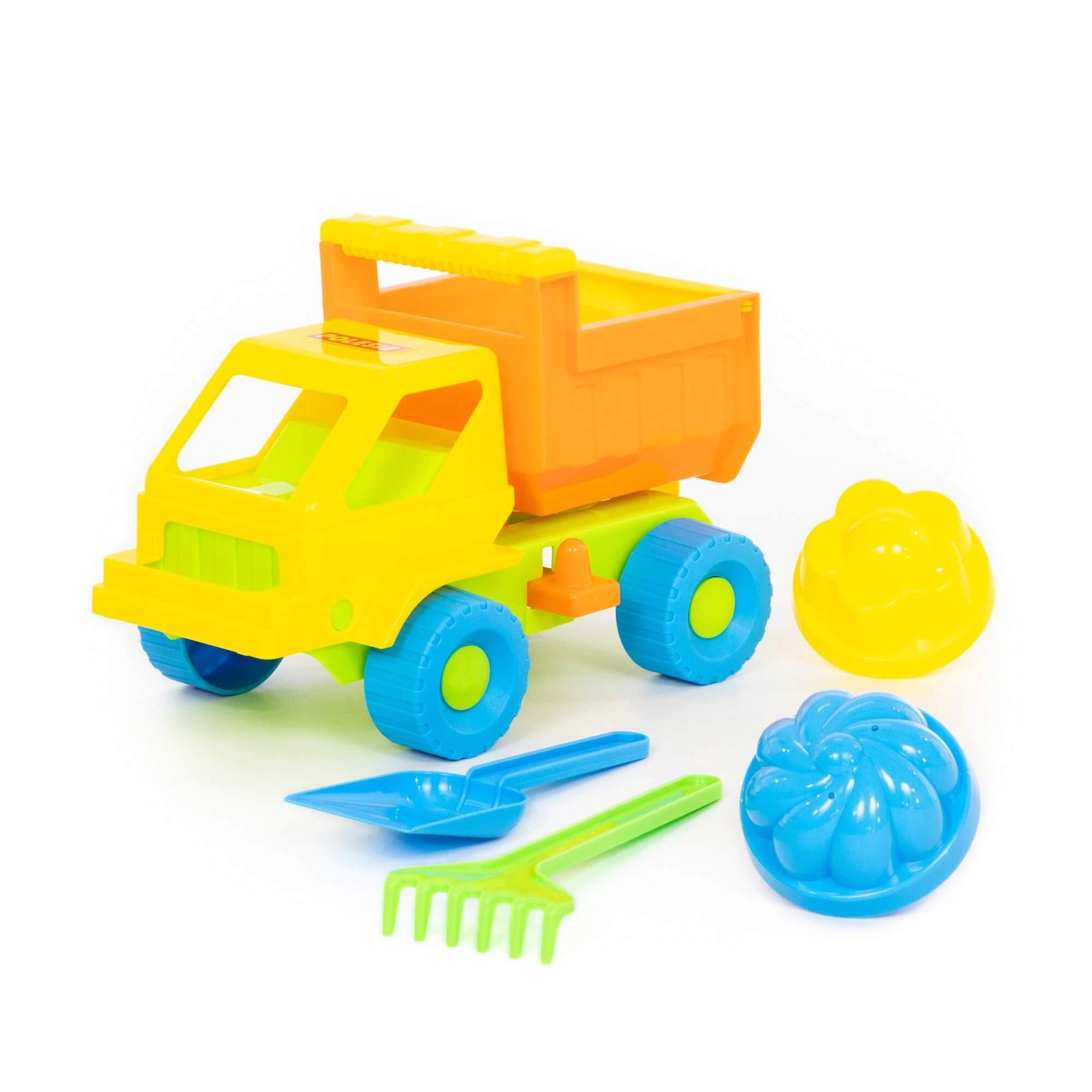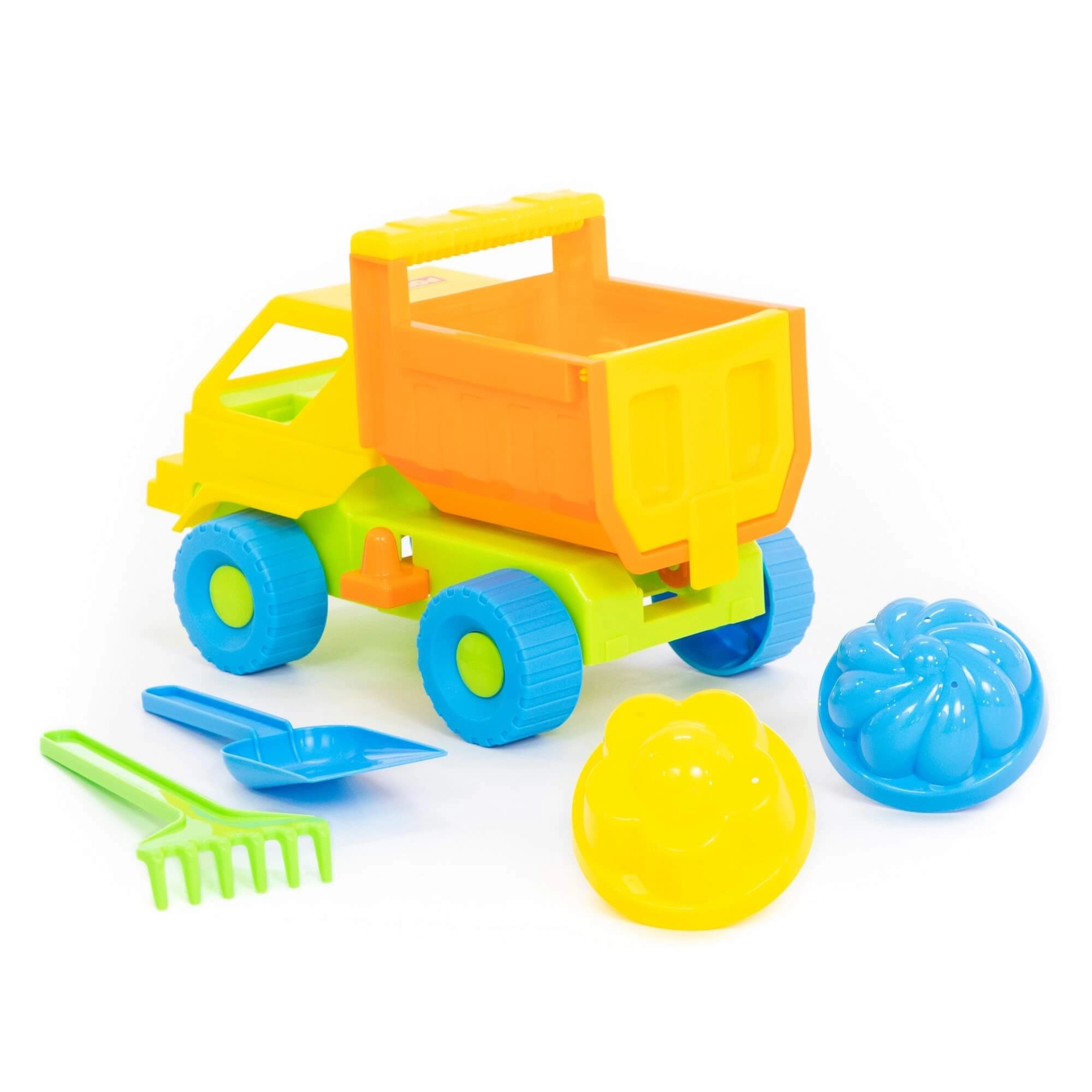 - Dotazione completa: camioncino con cassone ribaltabile, 2 formine, paletta e rastrellino.