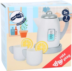 Il set include una teiera con coperchio e base, due tazze e fette di limone, permettendo ai bambini di simulare vere feste del tè. Il prodotto è realizzato con una combinazione di legno massiccio e compensato robusto, garantendo resistenza e durata.