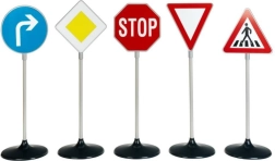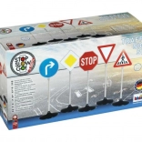 Il set con cinque dei segnali più comuni (ad es. STOP, Dare precedenza, Strada principale, Direzione obbligatoria, Attraversamento pedonale) aiuta i bambini a memorizzare rapidamente le regole di base.