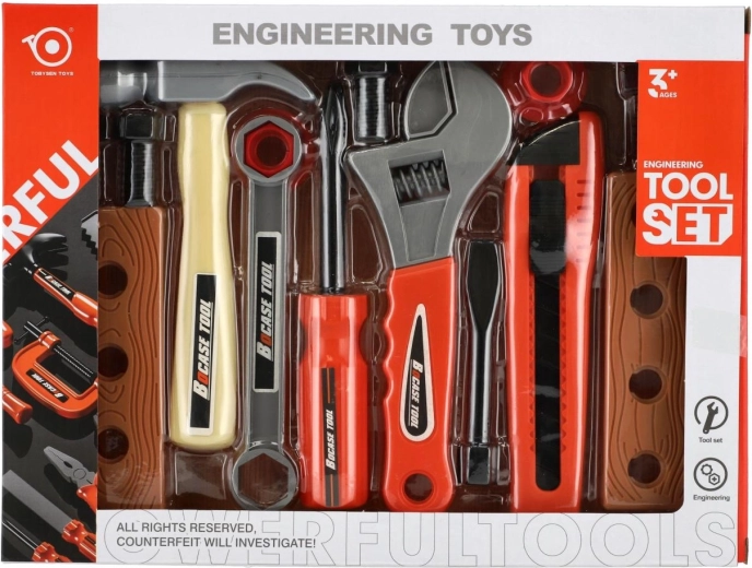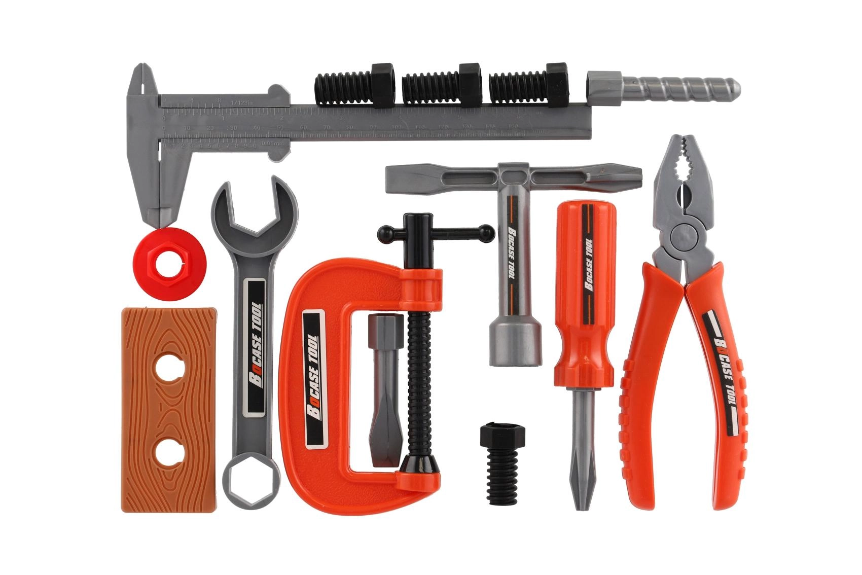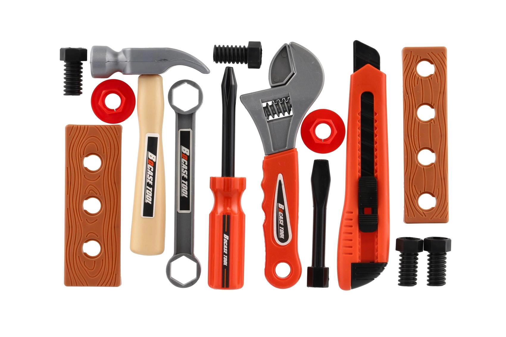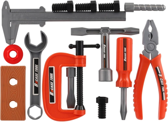 Gli attrezzi in plastica con bordi arrotondati e peso ridotto sono ideali per il primo approccio agli utensili. I bambini possono provare in sicurezza colpi, serraggi e misurazioni.