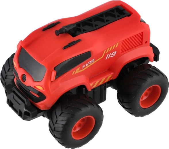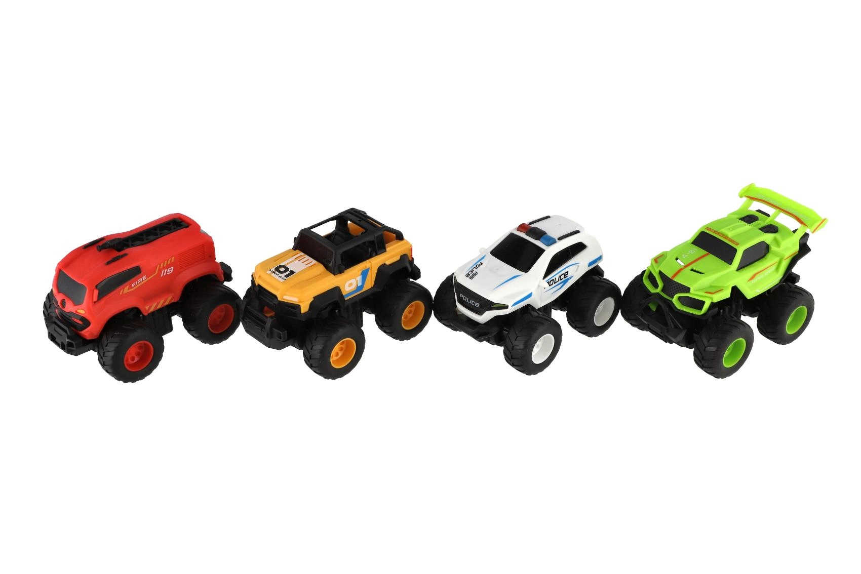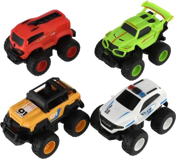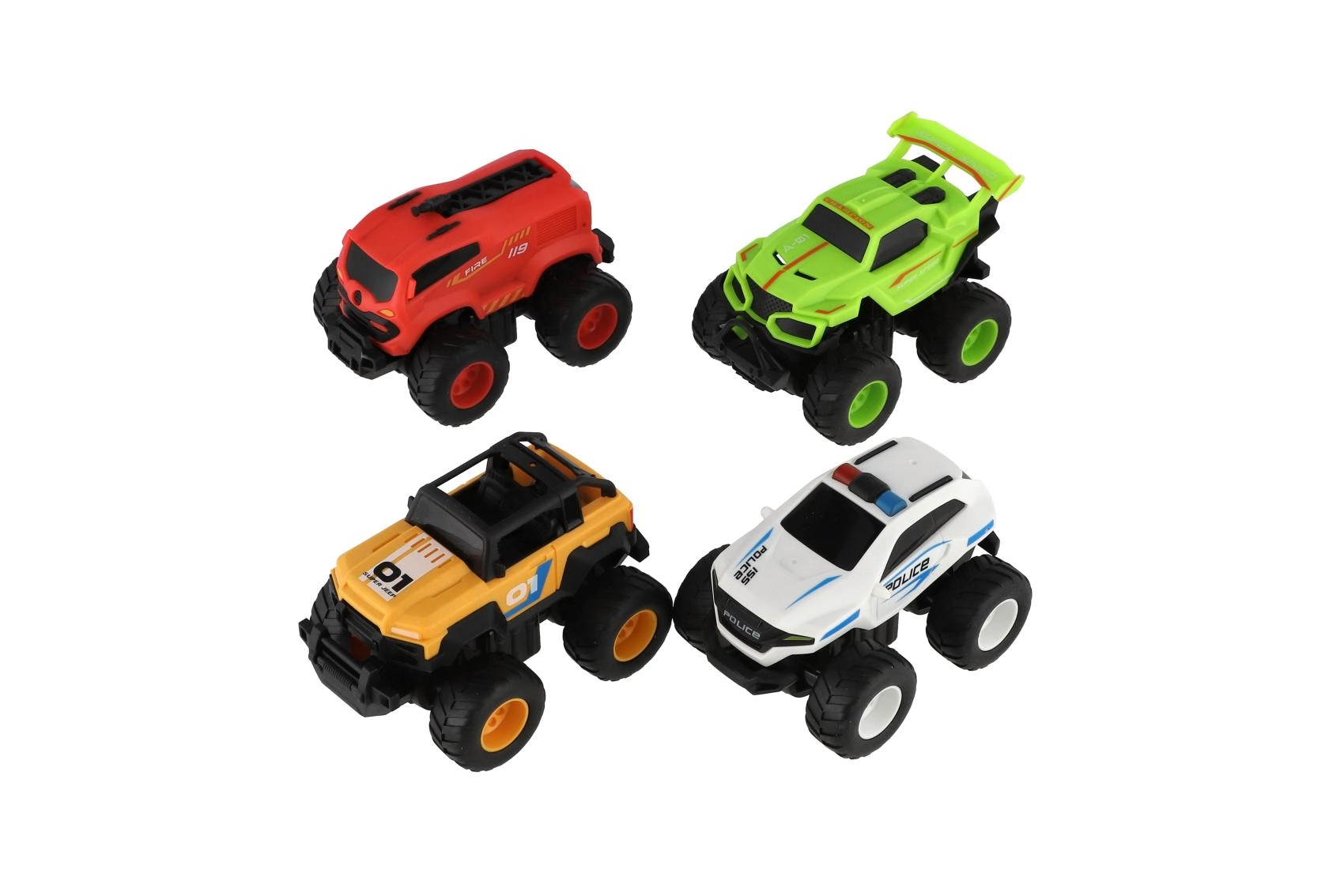 Nel set trovi versioni da corsa, polizia e vigili del fuoco, oltre a un monster truck sportivo – perfetto per giochi di ruolo e collezione.