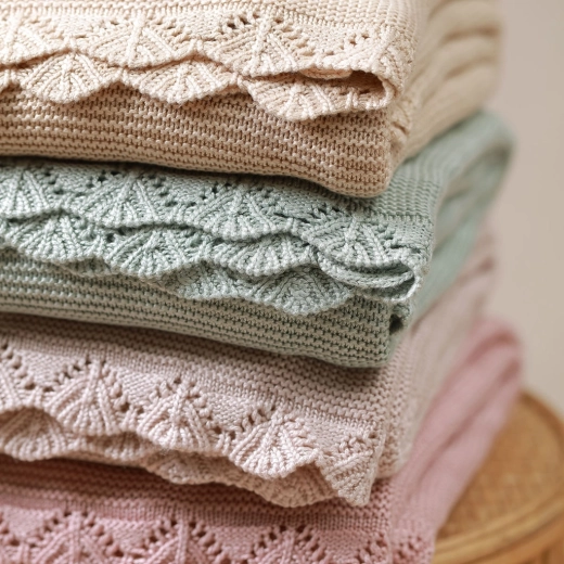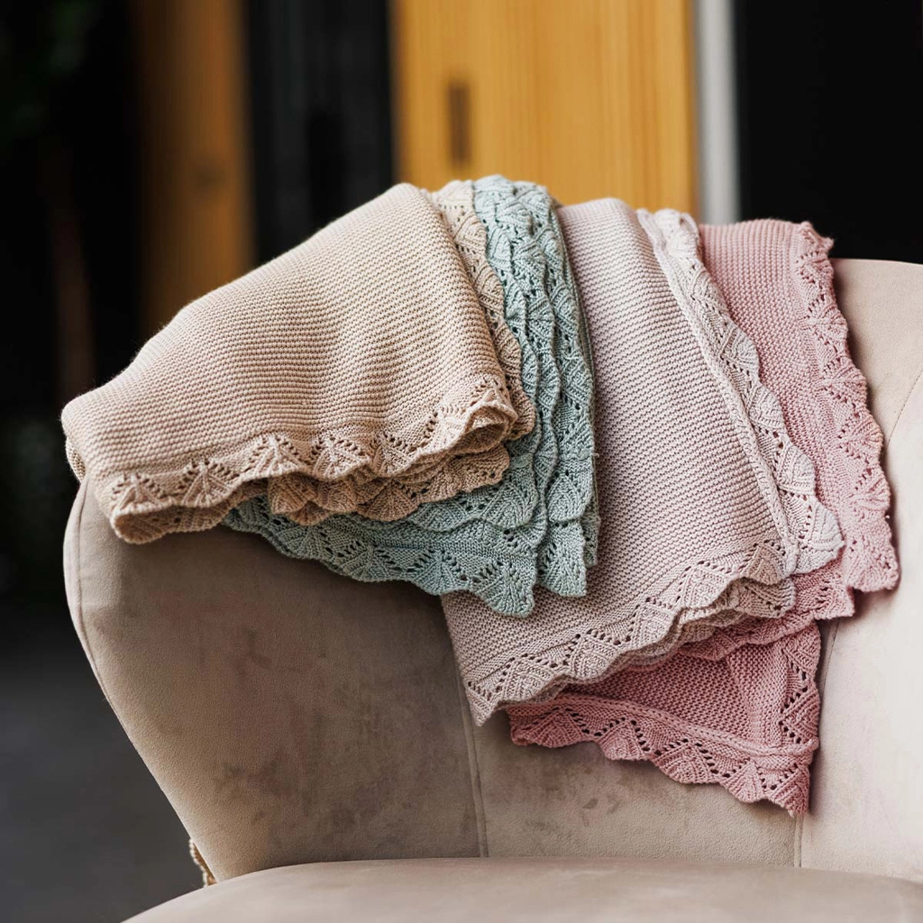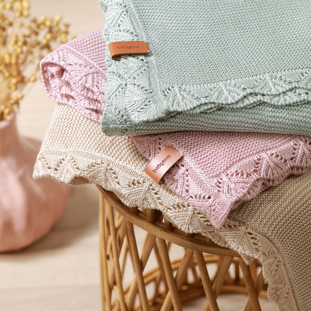 Il delicato rosa, il bordo decorativo e la misura 75 × 100 cm la rendono un accessorio ideale per passeggino, lettino e per i viaggi.
