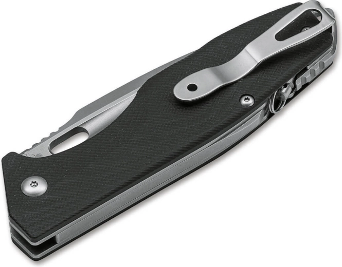 L’impugnatura in G10 nero è piacevolmente testurizzata, non scivola in mano e, insieme ai liner in acciaio, conferisce solidità al coltello. Dettagli pratici come la clip da tasca, il foro per paracord e il frangivetro integrato aumentano l’utilità sia nel quotidiano che outdoor.