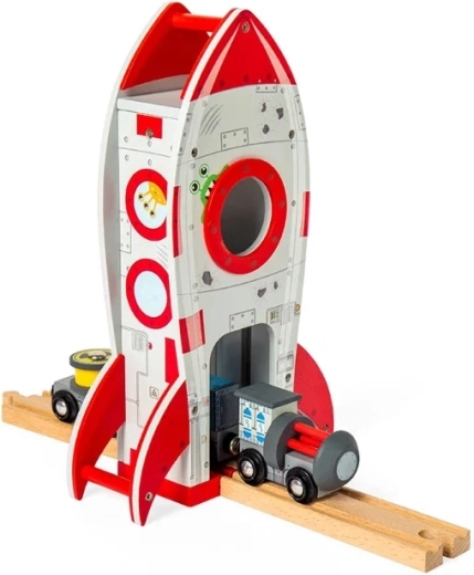 Il grande razzo con passaggio interno funge da tunnel a tema. Crea per i bambini un percorso cosmico in cui il trenino attraversa direttamente la rampa di lancio.