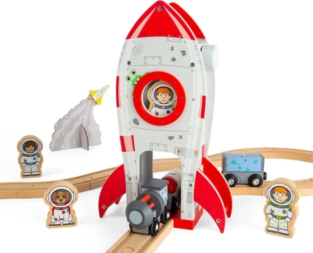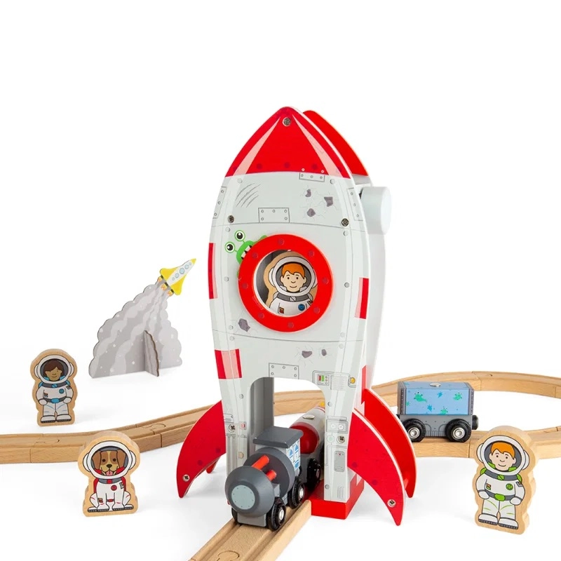 Il razzo è realizzato in legno certificato FSC di alta qualità e presenta una lavorazione resistente adatta al gioco quotidiano. I bambini sviluppano fantasia, comunicazione e coordinazione mano-occhio grazie alla semplice manipolazione degli accessori. La compatibilità con la maggior parte delle ferrovie giocattolo in legno garantisce un’espansione senza problemi del vostro set.