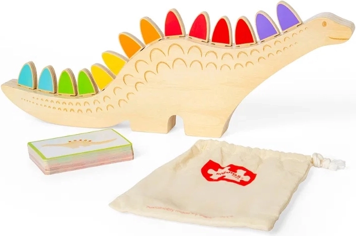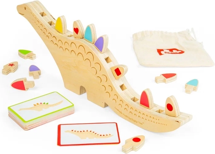 Questo creativo gioco di equilibrio e classificazione a tema dinosauro offre decine di scenari di gioco. I bambini possono abbinare per colore o forma seguendo le indicazioni sulle carte, oppure provare a bilanciare e impilare le tessere nelle scanalature sul dorso del dinosauro. Il gioco aperto favorisce autonomia, concentrazione e pazienza.