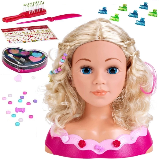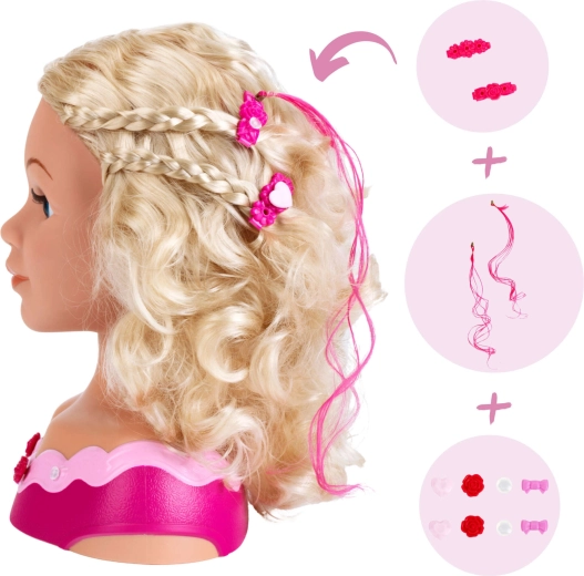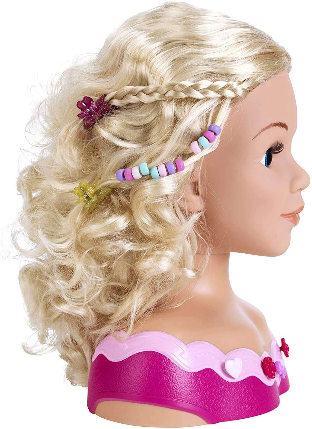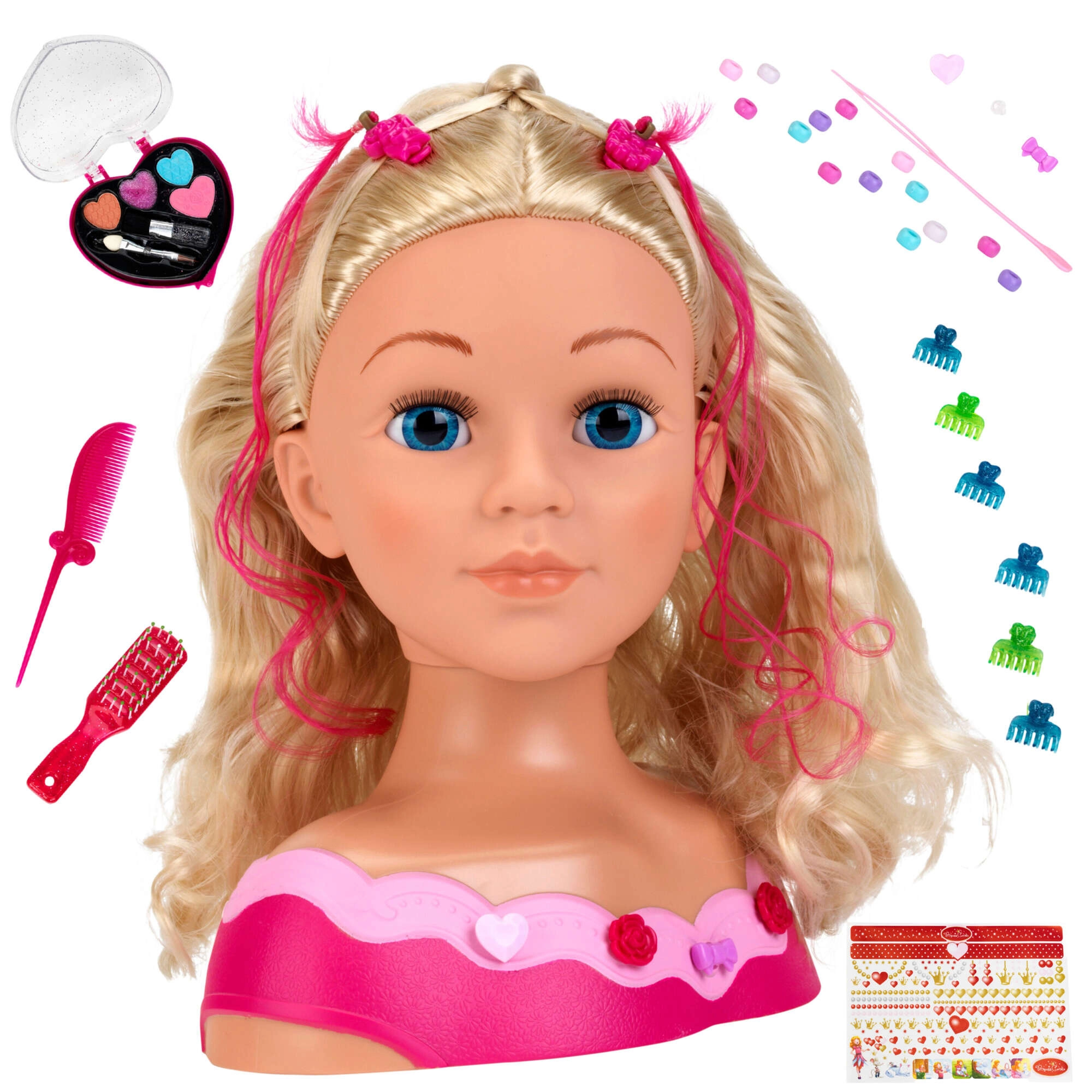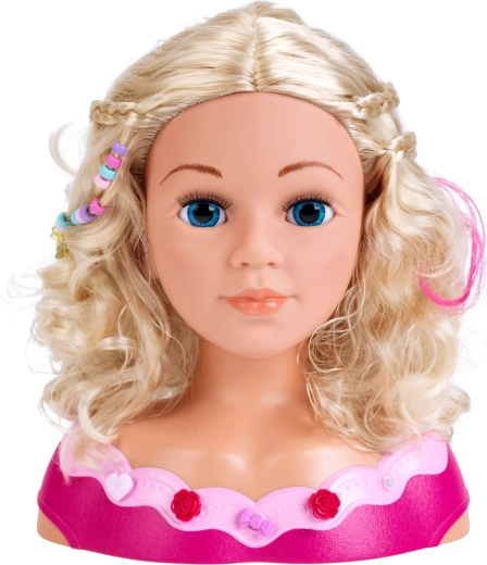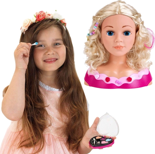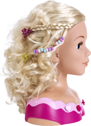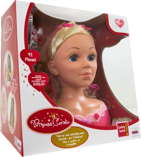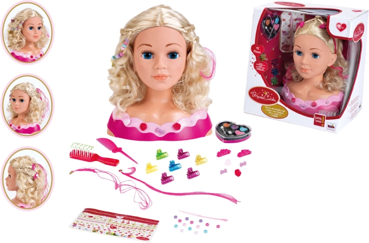 La testa per acconciature PRINCESS CORALIE farà felici tutte le piccole stylist. Capelli realistici, lunghi e facili da pettinare, occhi azzurri e una base rosa stabile garantiscono comfort e divertimento nel creare acconciature e make-up. La ricca dotazione con spazzola, pettine, mollette, perline e palette trucco per bambini apre la porta alla fantasia.